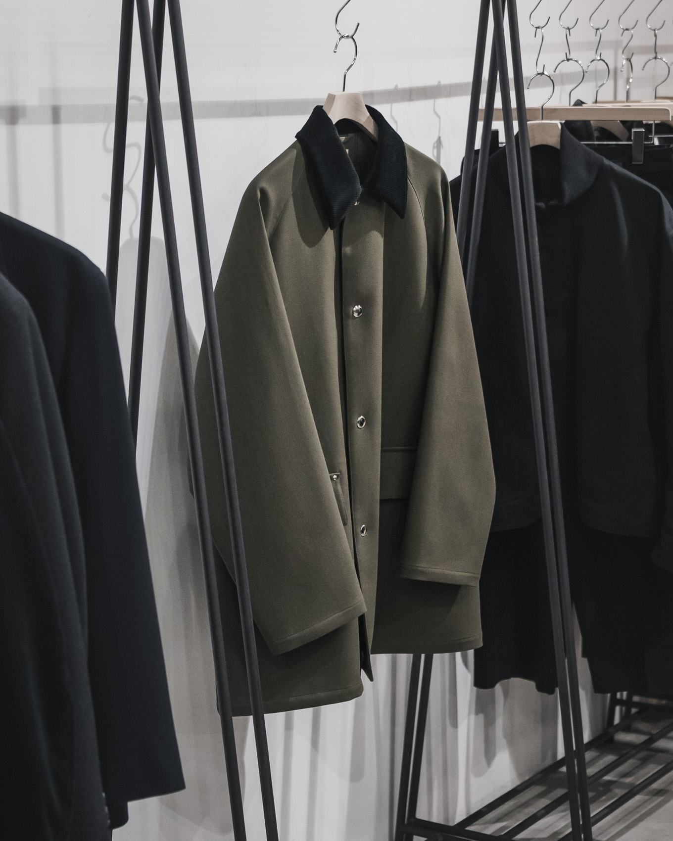 1940年代にフランス軍で採用されていたミドル丈のコートをモチーフにデザインされたミドルコートです。Blackには創業150年の尾州の機屋が手がける太番手を用いて織り上げた、しっかりとしたハリと適度な厚みのあるウールギャバジン素材を使用しています。Beigeには、現存する世界最古の生地商社であるフランスの老舗ファブリックメーカー”ドーメール”の手がける、とてもしなやかなウールギャバジンの生地を使用しています。オーバーコートをベースに製作することで、身頃にボリュームが出て、ロングコートに引けをとらない、存在感のある1着となっています。