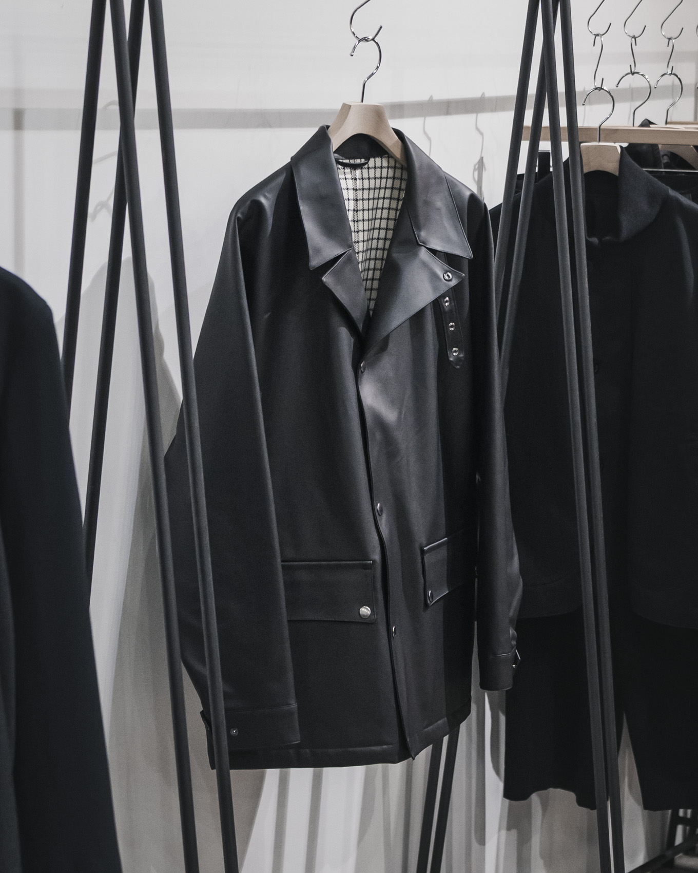 1940年代のイギリスのモータサイクルブルゾンをインスピレーションにデザインされており、襟元のチンスラップやウエストベルトなど特徴的なディテールを押さえながらも、ドレスアイテムとの合わせが良い、ブランドらしい1着にまとめたアイテムです。素材にはクラシックなラバー見えの表情でありながら透湿防水性を兼ね備えた特殊なラミネート素材を使用しています。機能性を備えつつ、光沢を抑えたマットで上品な質感に仕上げています。