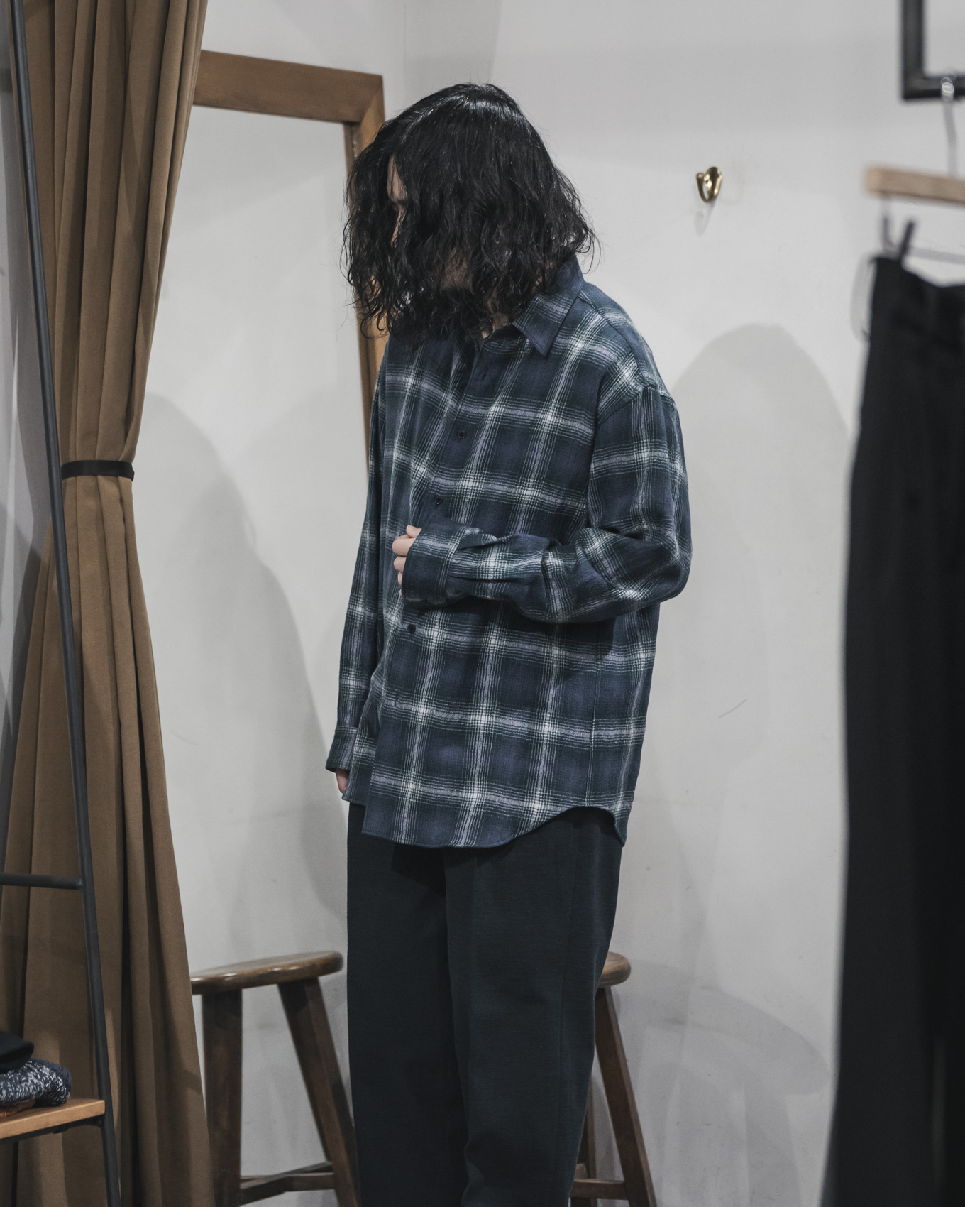 極細梳毛ウールを特殊な手法で甘く撚った糸を使用し、負荷がかからないよう、ふんわりと織り上げた素材で製作されています。また、仕上げとして自然な風合いを生かす加工を施すことで、快適な着心地に仕上げています。着こなしに彩りを与える、古着のネルシャツのような配色と凹凸のある表面感が特徴で、羽織としては勿論のこと、インナーとしても大変重宝できるアイテムとなっています。