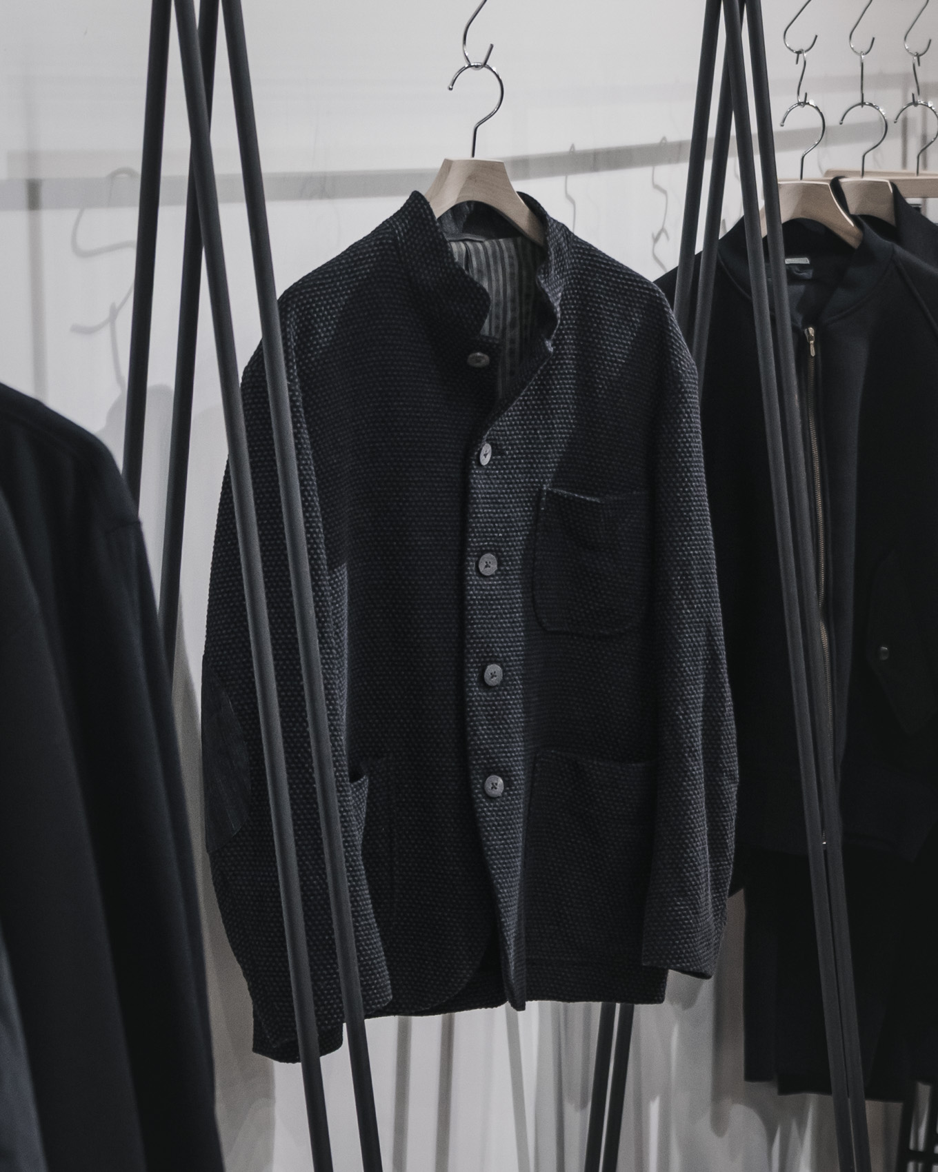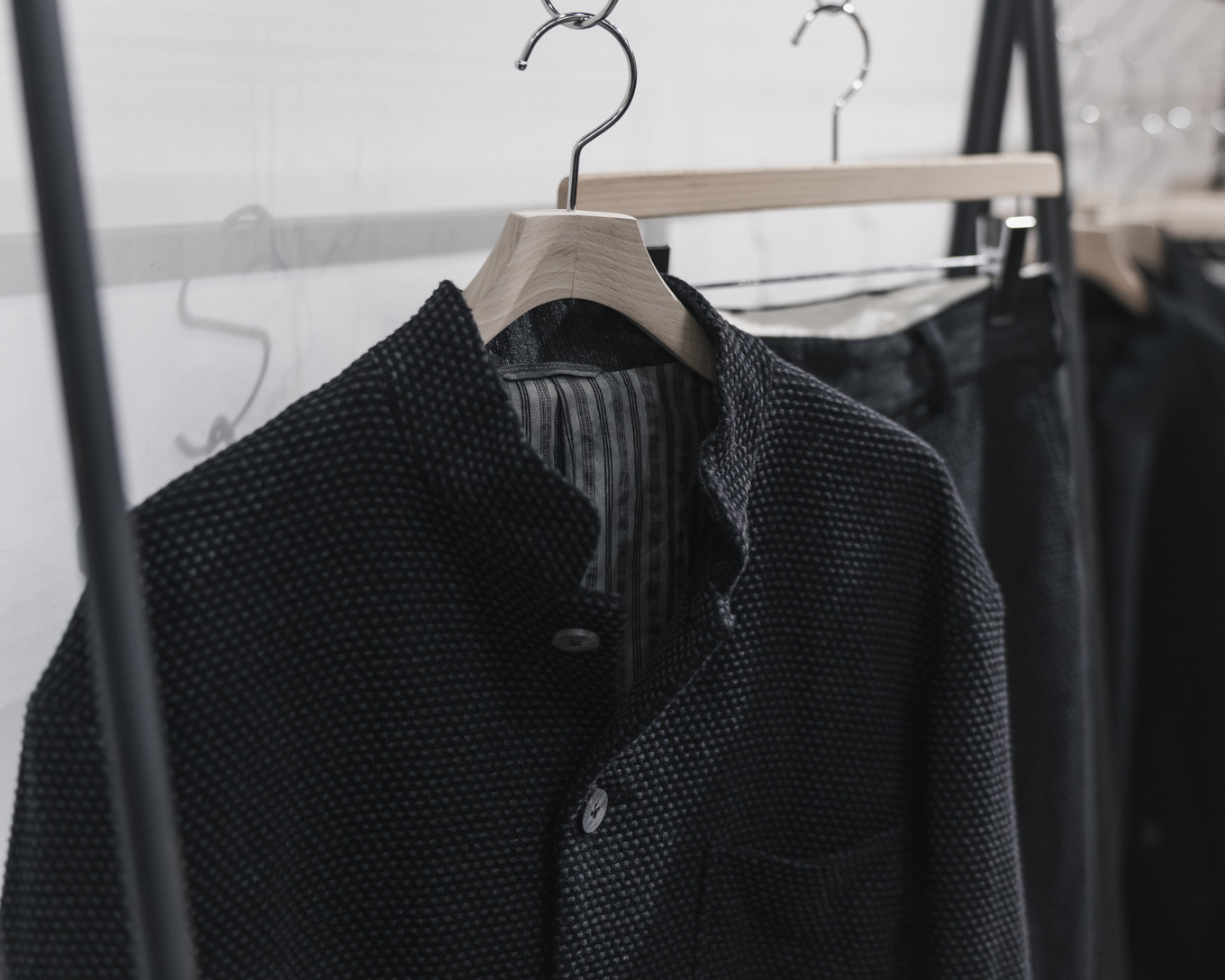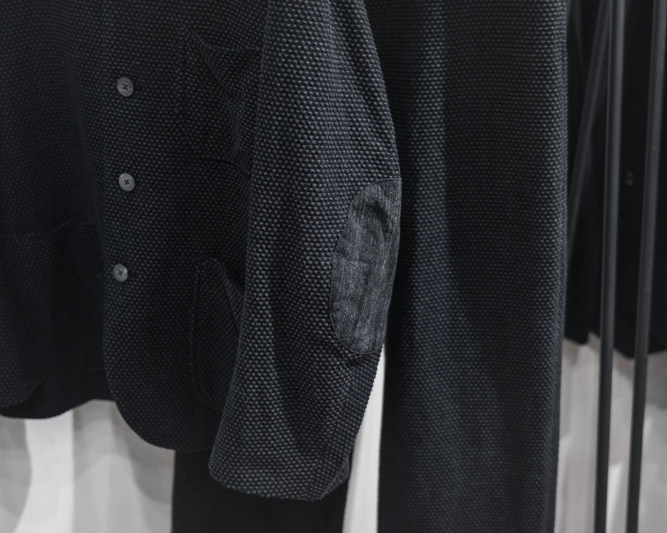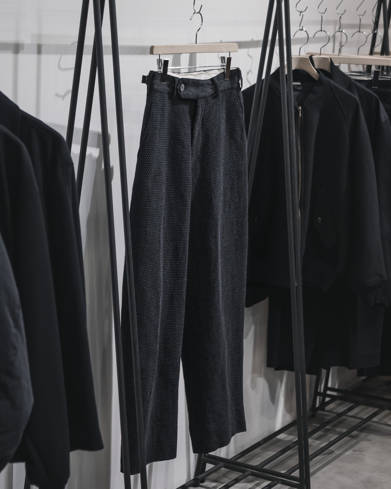 アイテムは、日本の伝統技法である、刺し子生地を使用した、ジャケットとボトムスです。