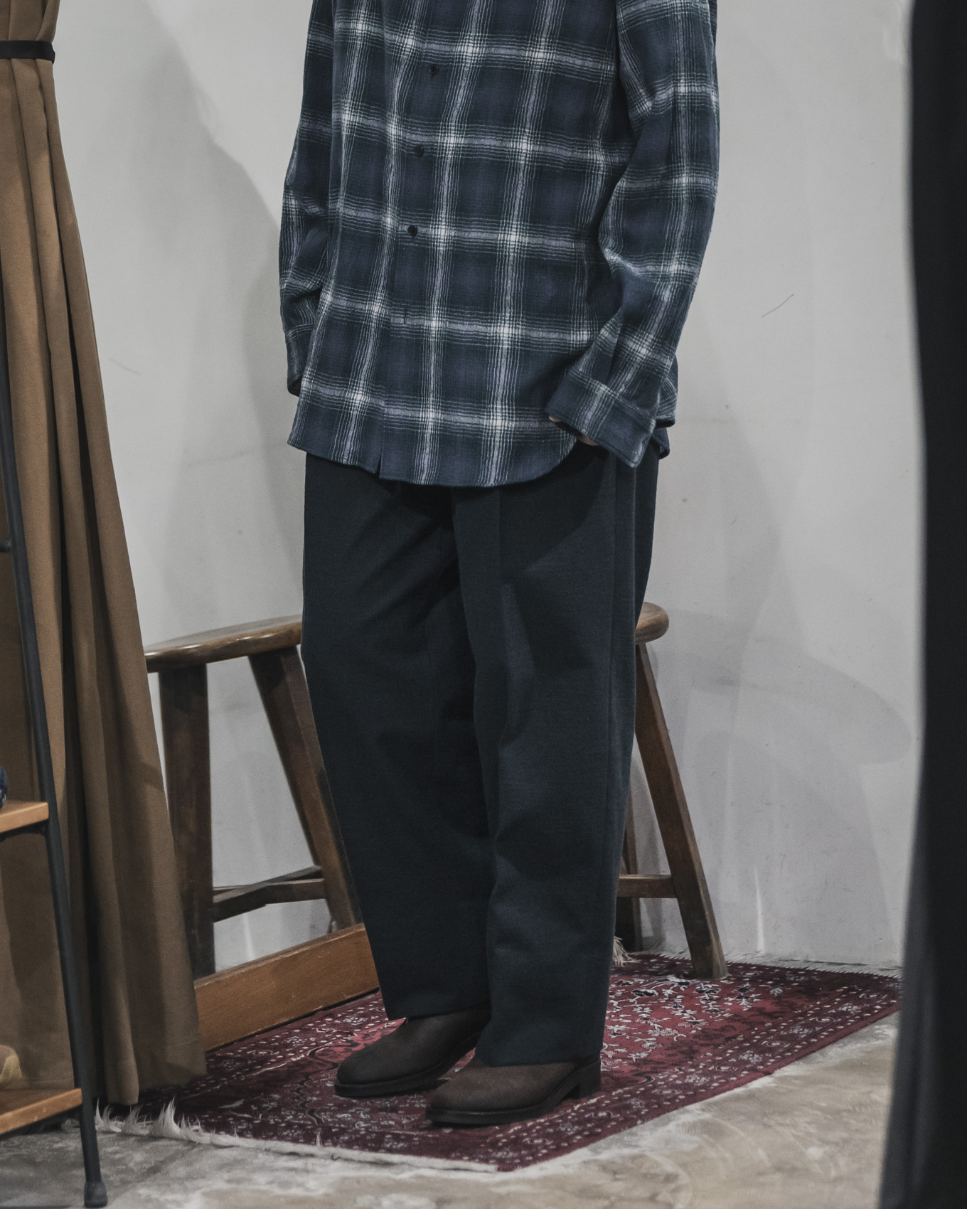 生地を硬化させたハードコットンを揉んだり叩いたりと加工を重ね、コシを残しながらも砕けている感じを狙い仕上げた生地を使用しています。コットン素材ではありますが、表面には横に走るスラブ調の毛羽があり、単調ではない表情豊かな質感が特徴的です。デザインは80年代アメリカのウールスラックスをベースとした、ワイドテーパードシルエットのトラウザーで、カジュアルな太さがありながらも、綺麗な印象で履いてもらえる1着です。