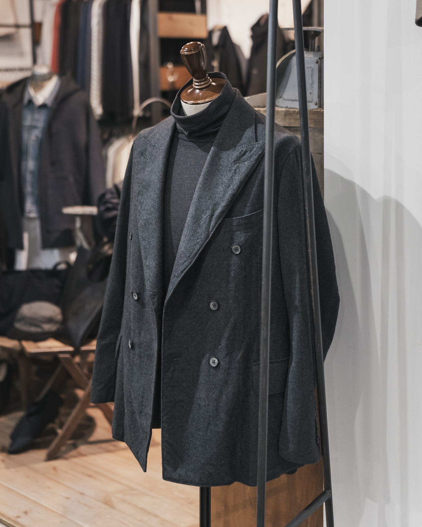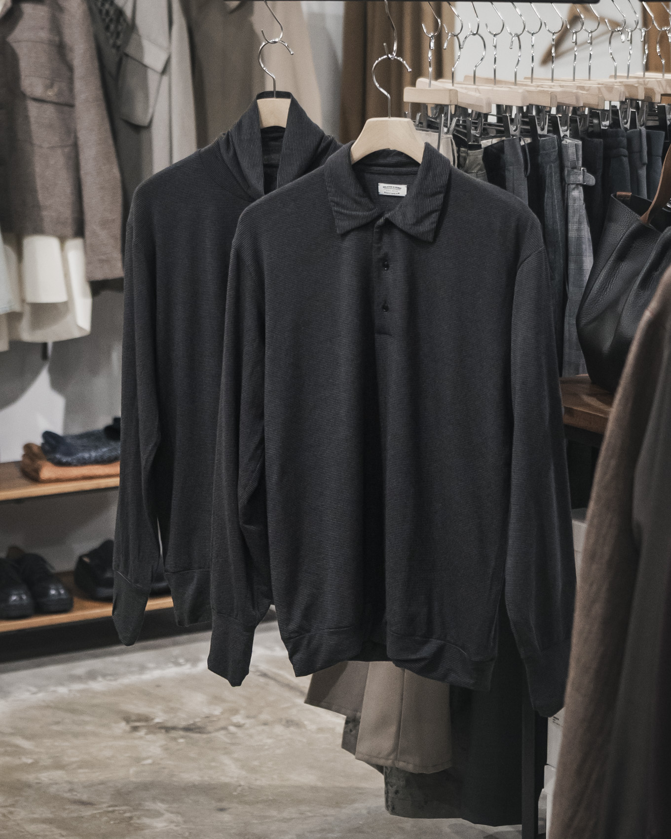セルロースをベースにシルクやカシミヤを加え、ヌメりのあるタッチと適度な光沢を持たせた生地を使用しています。薄いながらもモチッとした独特な質感が着心地の良い着用感にしています。型は、ポロシャツとタートルネックのロングスリーブで、生地を二重にすることで、秋冬のアイテムとして暖かくも重ね着してもかさばらない、使い勝手の良いアイテムに仕上がっています。