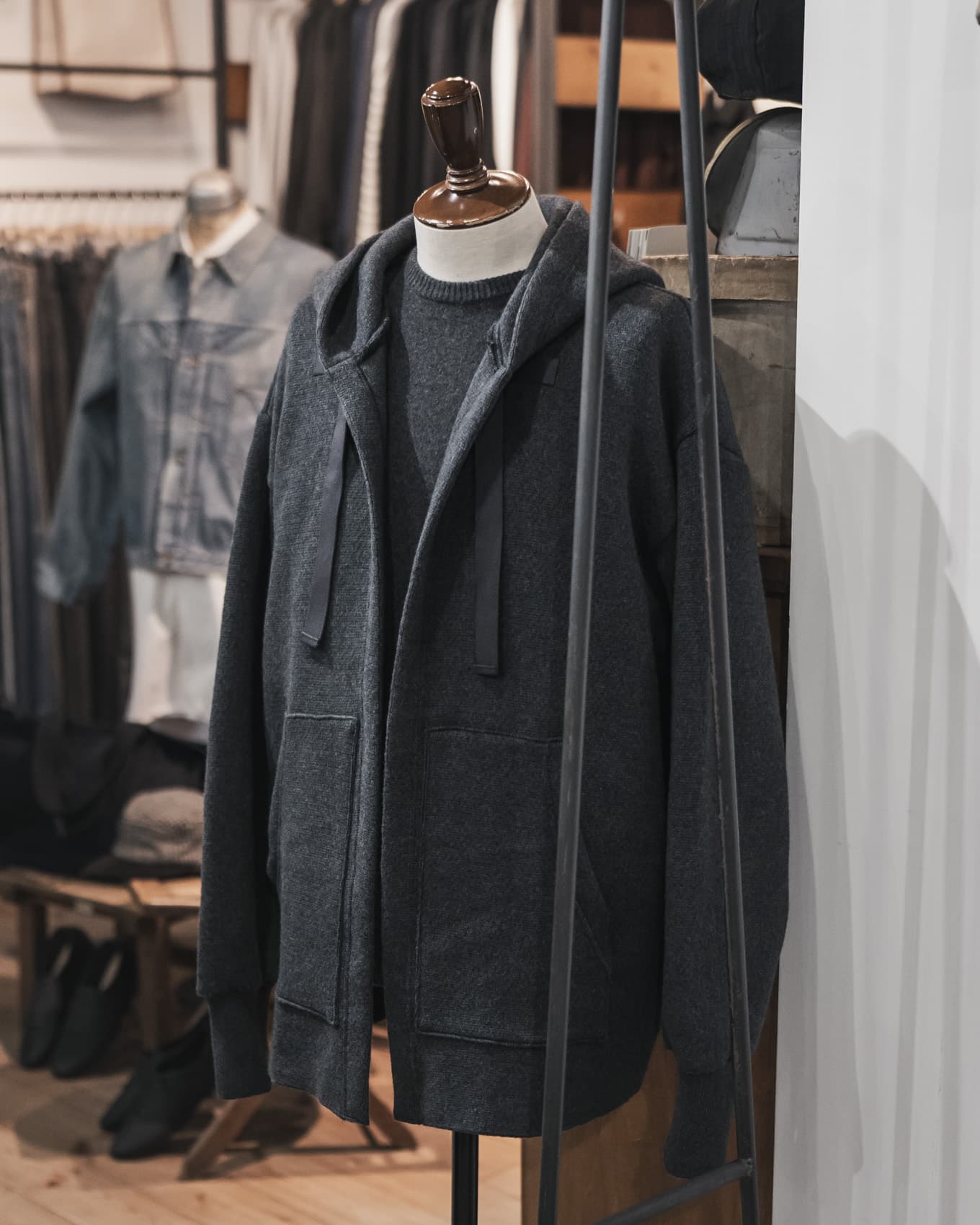アイテムは、デザイナーが昨年様々なシチュエーションで着用する機会が多く、今期も継続型として展開されたニットフーディと、カシミヤにも引けを取らない極上のウール原料を用いて製作されたプルオーバーのニットです。