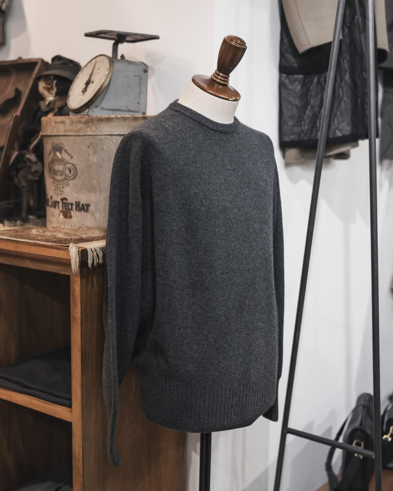 ウールの中でも14.3ミクロンという繊維の細かさを誇り、カシミヤの等級で当てはめても1等級か2等級に値する最高品質のウール原料を使用したニット素材を使用しています。カシミヤのような滑らかなタッチで高級感がありながらも、ウールの繊維の持つ適度なハリ感によって立体的なシルエットが特徴的な1着です。