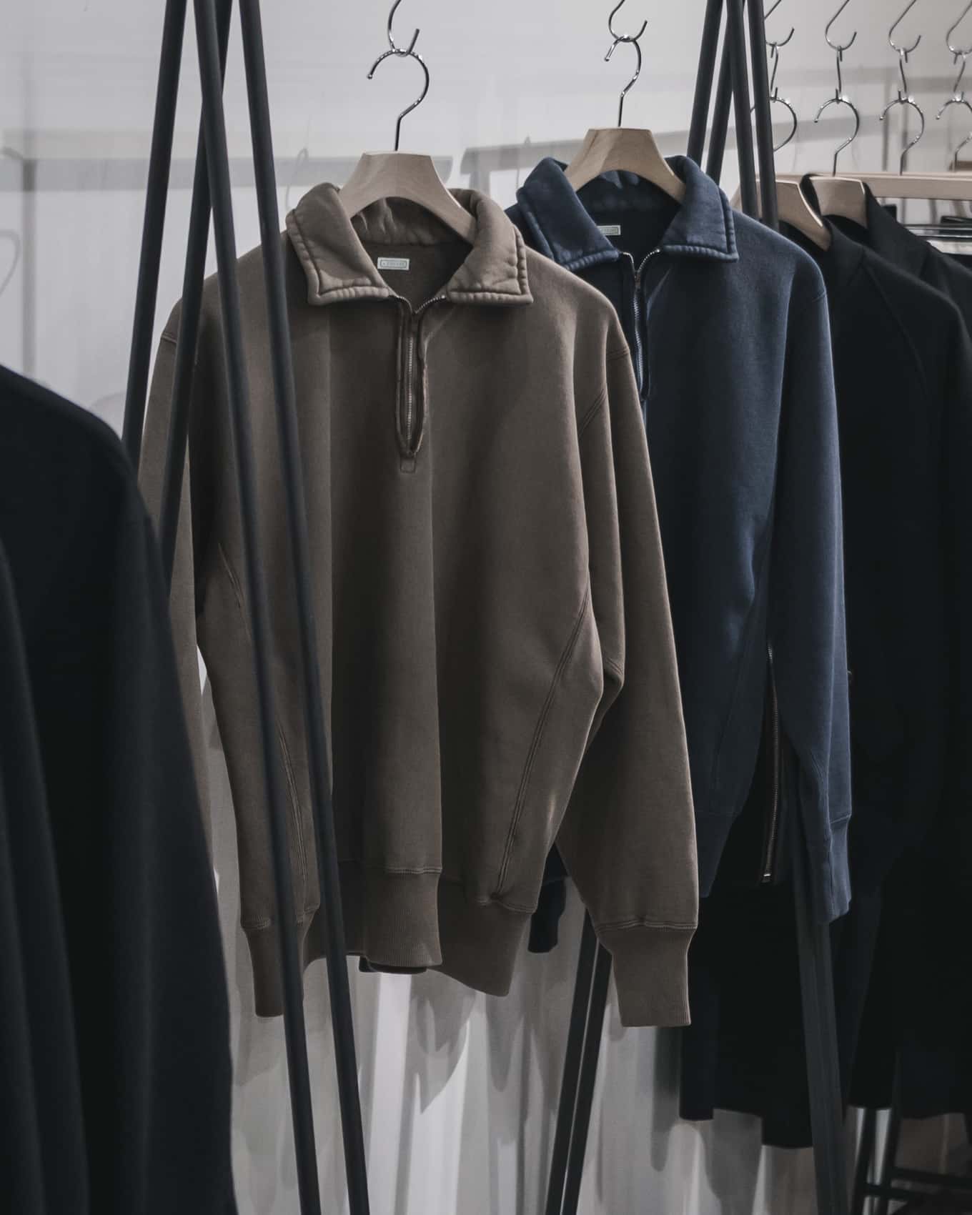 ヴィンテージを踏襲し、縫製仕様も忠実に再現したハーフジップスウェットです。生地は、ベースアイテムの糸を解析して作り込まれた裏起毛生地を使用しています。型は、ヴィンテージ感のある短丈で、袖は太くせず適度な太さに設定しています。インナーにも使いやすいちょうど良いゆとり感で、肩ハギがないディティールも忠実に再現し、丸みのあるシルエットに仕上がっていることも特徴です。ヴィンテージさながらのスウェットシャツは、ミリタリーパンツやワークパンツとのカジュアルなスタイリングは勿論、スラックスやジャケットなどの上品なアイテムに程よい抜け感をもたせることもできます。
