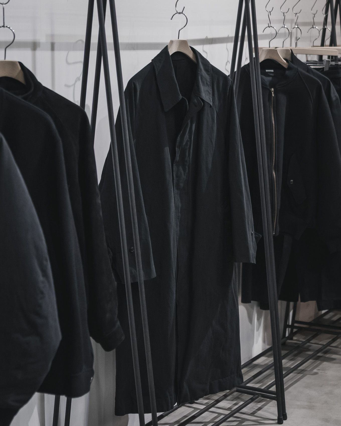 製品染めによる動きのある仕上がりや色味がとても良く、上下黒のあわせの中で、ニュアンスを持たせることができます。また、ゆったりとしたフォルムのため、インナーを調節しながら、春、秋、冬の季節にあわせて着こなしやすいことも特徴です。