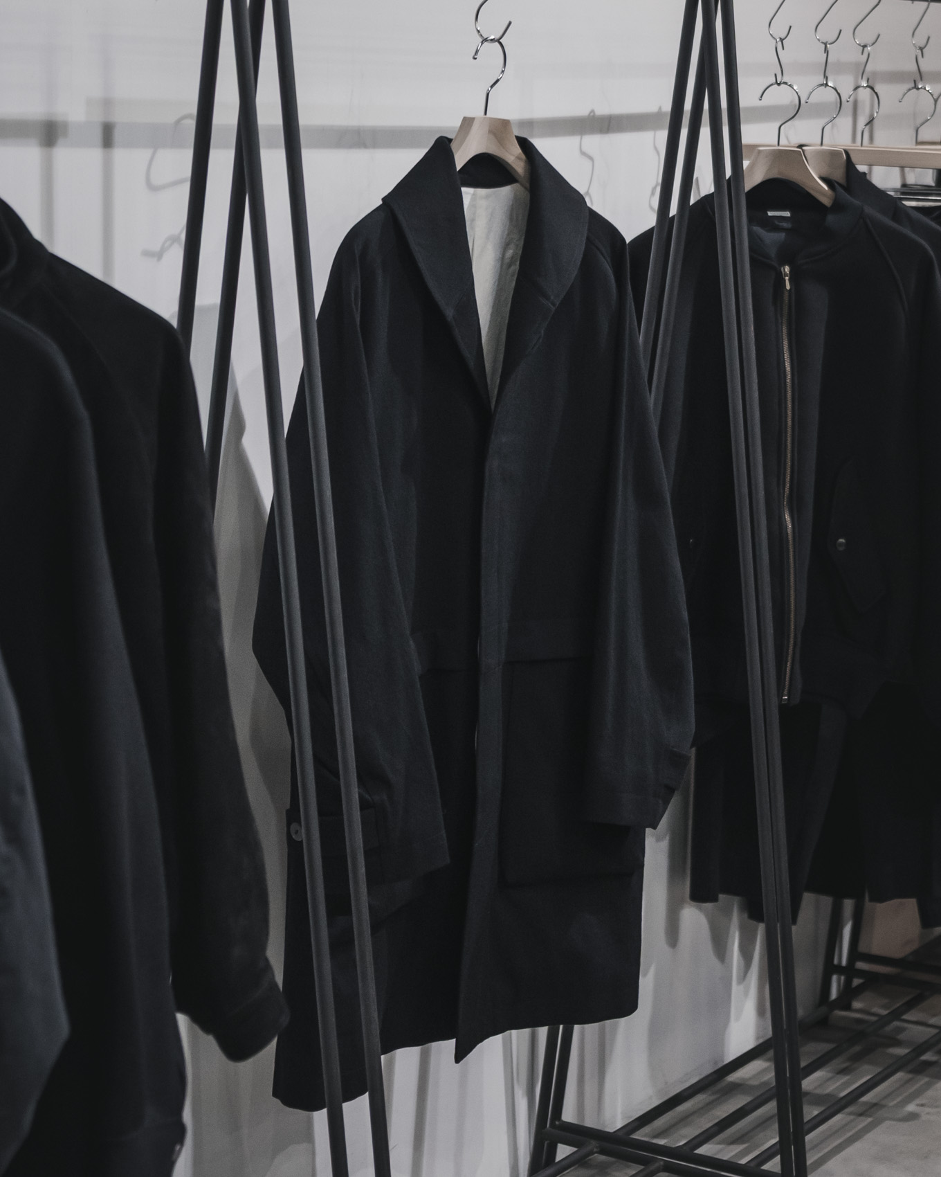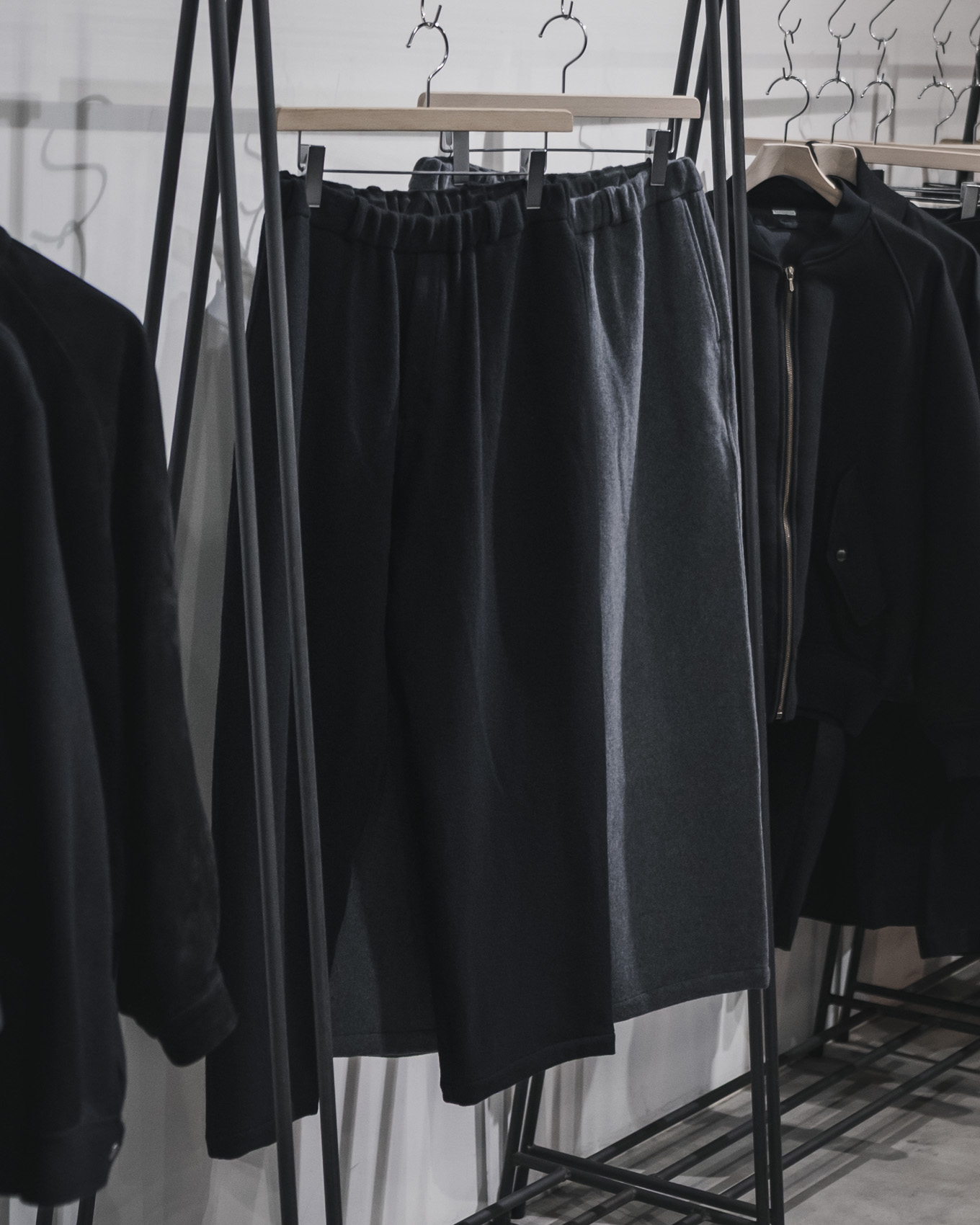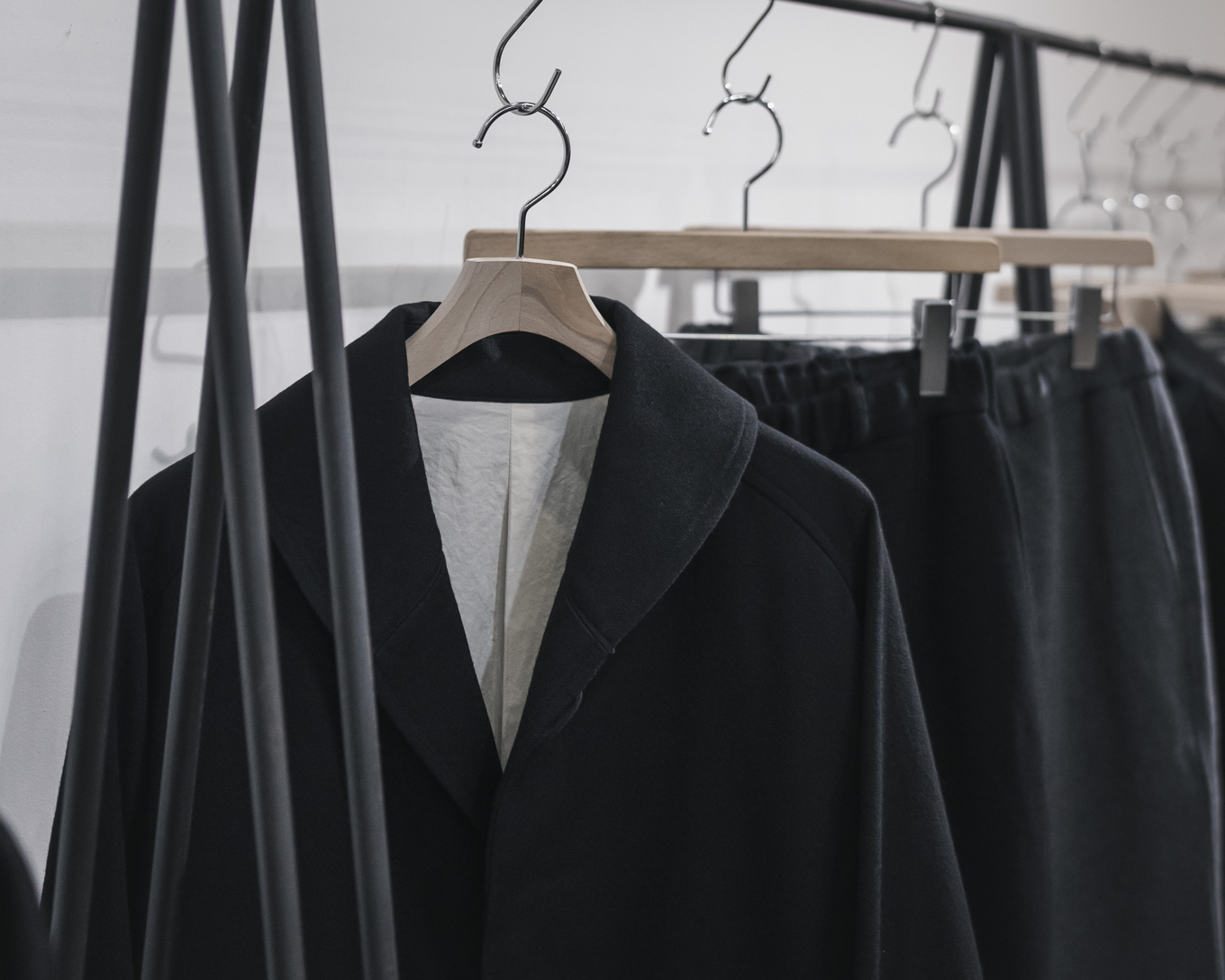 ウールコットンツイル素材を使用した新型のたショールカラーコートと、Super100原料を使用したモッサ生地を使用したワイドパンツです。どちらも冬の気候での着用をメインとする、これからの時期に適したアイテムです。