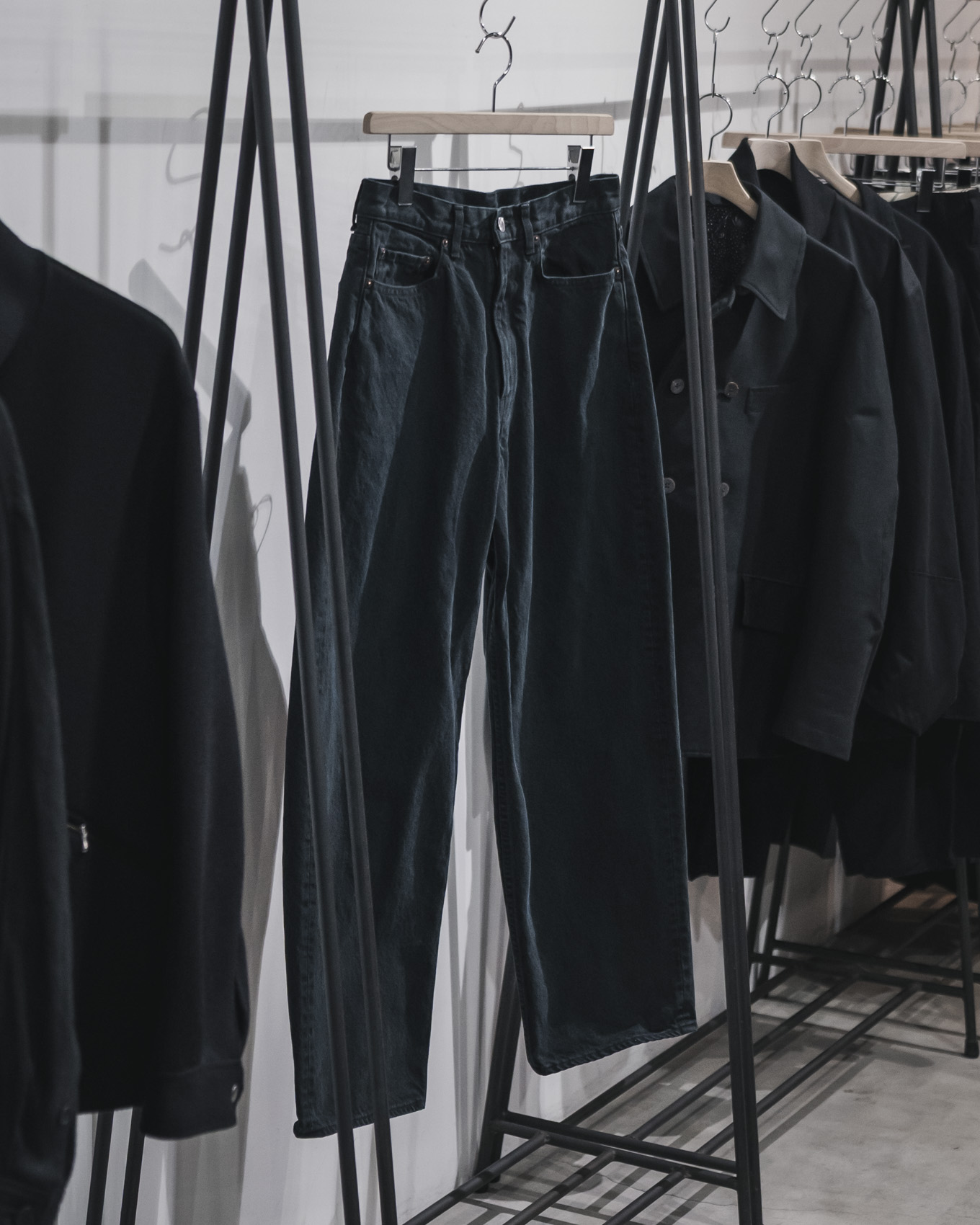 ユーロLEVISの特徴的な青みのあるブラックの色落ちを再現した加工感が特徴のデニムパンツです。オーセンティックなデニムパンツですが、ゆったりしたテーパード型で作製することで、現代的な印象も兼ね備えた1着に仕上がっております。クラシックなアイテムは勿論のこと、スニーカーやスウェットなどのストリートの雰囲気も感じられるアイテムとの組み合わせもお勧めです。