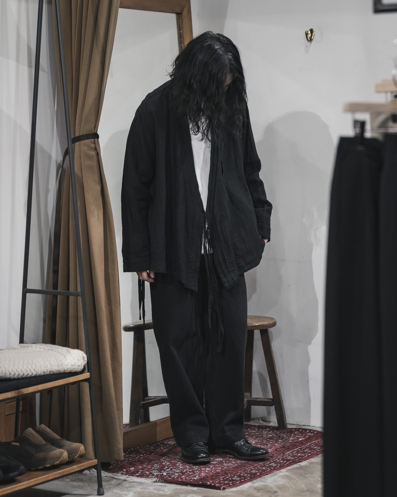テーラードジャケット、クラシックシャツ、東洋の伝統的な衣装といった多様なアイテムを組み合わせ、新たに製作されたジャケットです。ボックス調のシンプルなボディバランスに、レイヤードさせた前立てや、紐による留め具などによってデザイン性を持たせています。一見特徴的なデザインですが、シャツやカーディガンのように軽い着心地のジャケットとして、春夏の羽織りとして活用しやすい1着です。