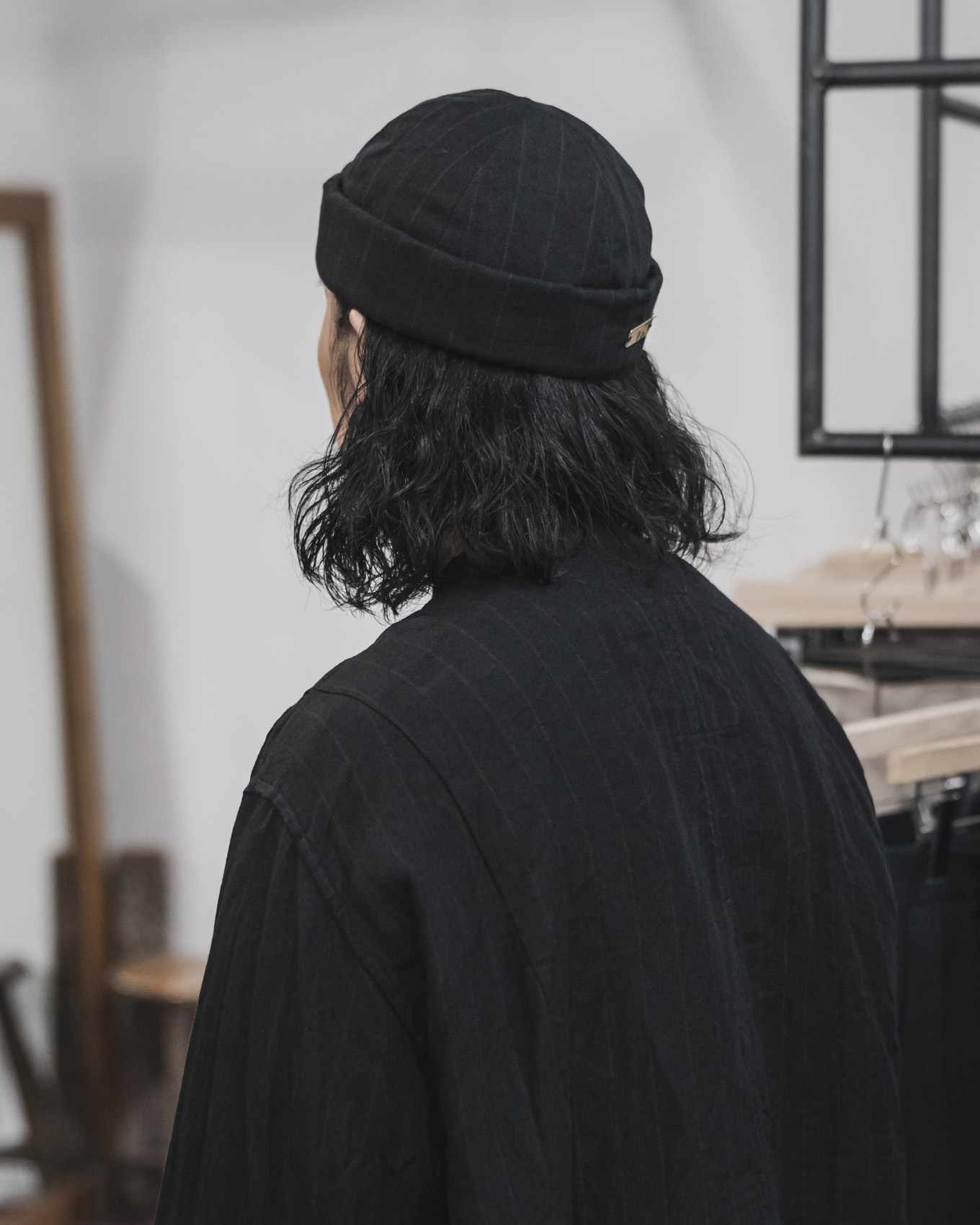 立体的なパターンによるフィッシャーマンキャップです。今回使用されたリネンストライプ素材は、ドライなタッチとハリ感がありながら、柔らかな質感も共存する生地のため、綺麗なフォルムを保ちながら、膨らみも出過ぎないとてもバランスの取れた生地に仕上がっています。ツバの付かないフィッシャーマンキャップは、ニット帽のような感覚で合わせられるので使い勝手の良いアイテムです。