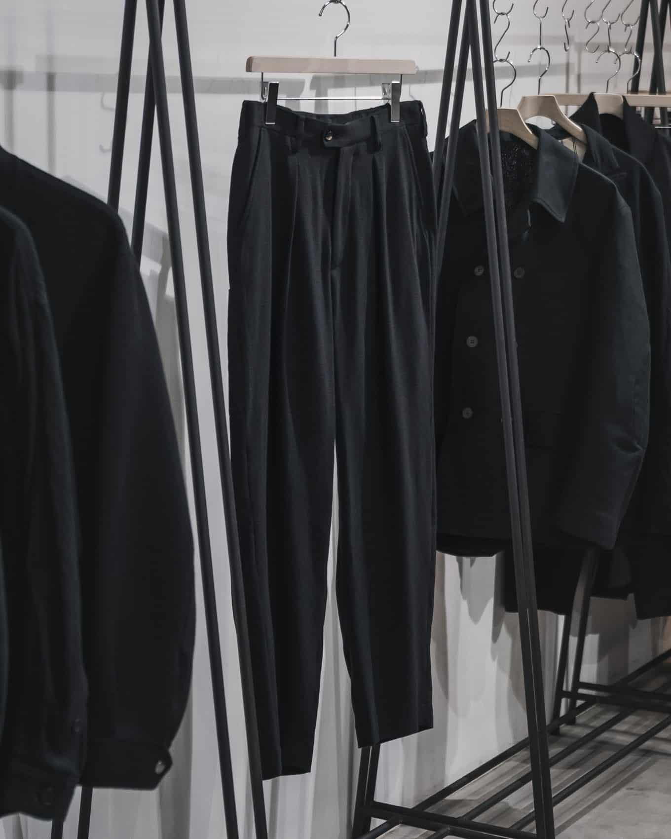 1990年代のフレンチスラックスのリラックスしたフォルムとイギリスのクラシックな仕立てをリファレンスとし、オリジナルパターンで製作されています。腰まわりにゆとりを持たせつつ、裾にかけて緩やかにテーパードするシルエットで、動きやすさと洗練性を両立させリラックスした佇まいを演出しています。同素材のジャケットも展開されており、セットアップでのあわせもお勧めです。