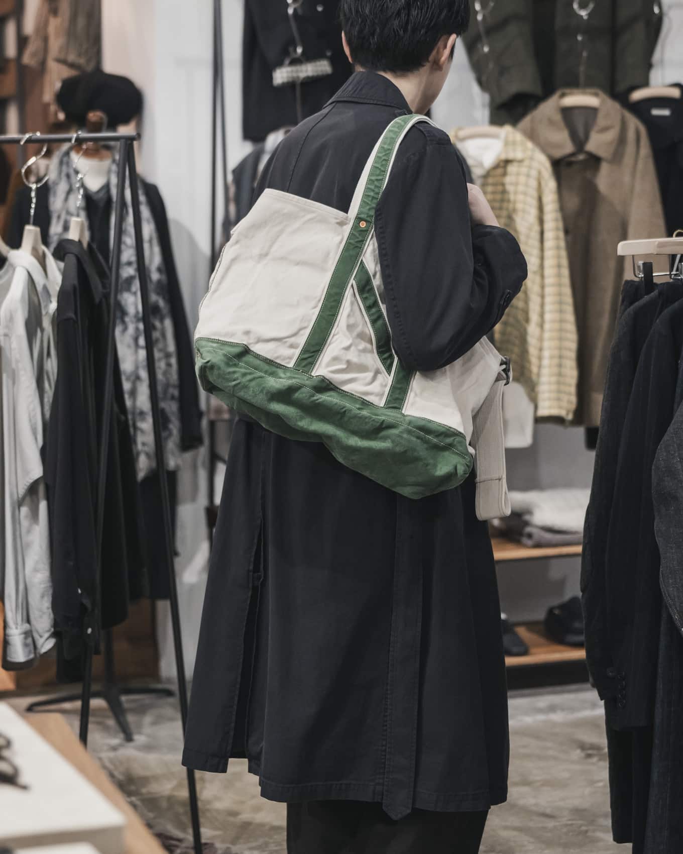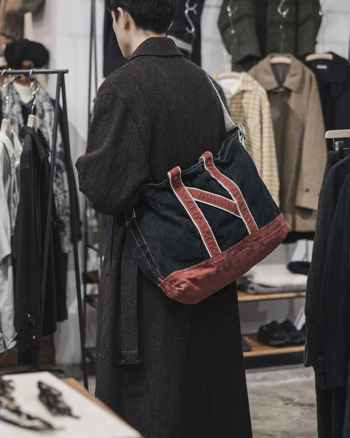Super140’sの原料を使用したツイルチェックを特殊な起毛加工で仕上げた、シャツ、ジャケットやスラックスとともに、定番的に展開されているNNショルダートートバッグや新型のバッグなどが入荷しております。