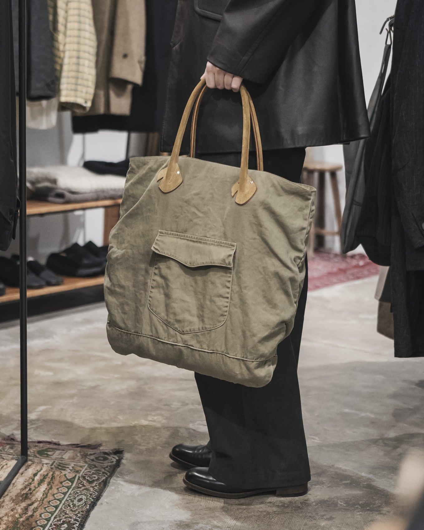 1970年代のUSヘルメットバッグと1980年代のUSトートバッグの形状をリファレンスとした新型のバッグです。高混率リネン綿混紡単糸を使用し、製品加工で自然なシワ感と生地の擦れ感を引き出すことで、よりリアルなエイジング感を表現しています。ハンドル部分には使用されている生地と相性の良い、カウレザーのスウェードが採用されています。細かなディテールや加工はヴィンテージムードが漂う仕上がりになっています。