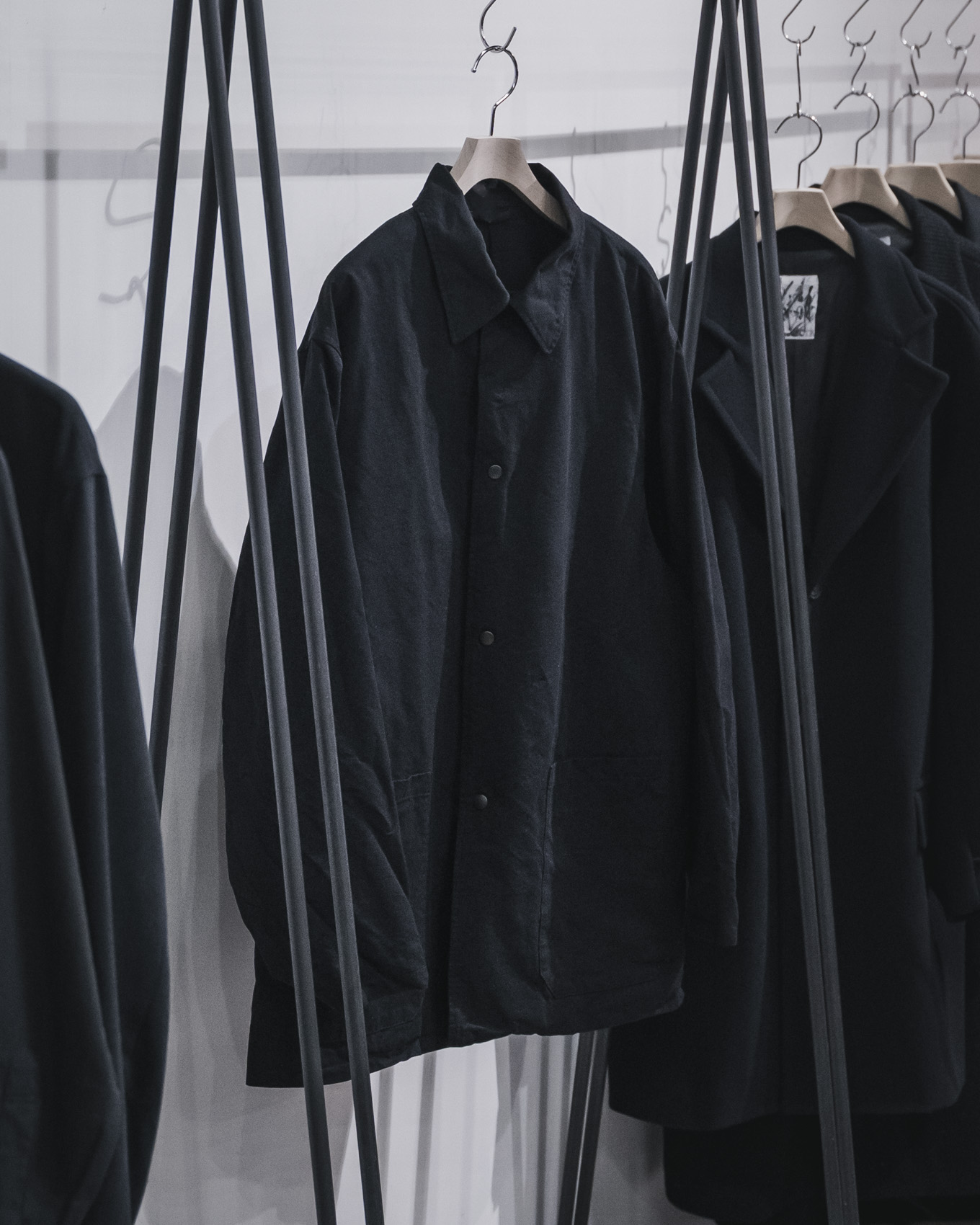 昨年の春夏、秋冬に続き、今期も継続して展開されるポストワークツイルジャケットです。生地はコットン・ポリエステルにウールをわずかに混紡した素材を使用。一般的なワークウェアに見られる綿ポリツイルとは異なり、程よいハリ感に加え、ほのかな風合いも感じられる生地に仕上げています。腰ポケットにはドット釦のみを配し、匿名性の高いユニフォームのような佇まいにしている点も特徴です。裏地には軽めのコットンネルを使用しています。