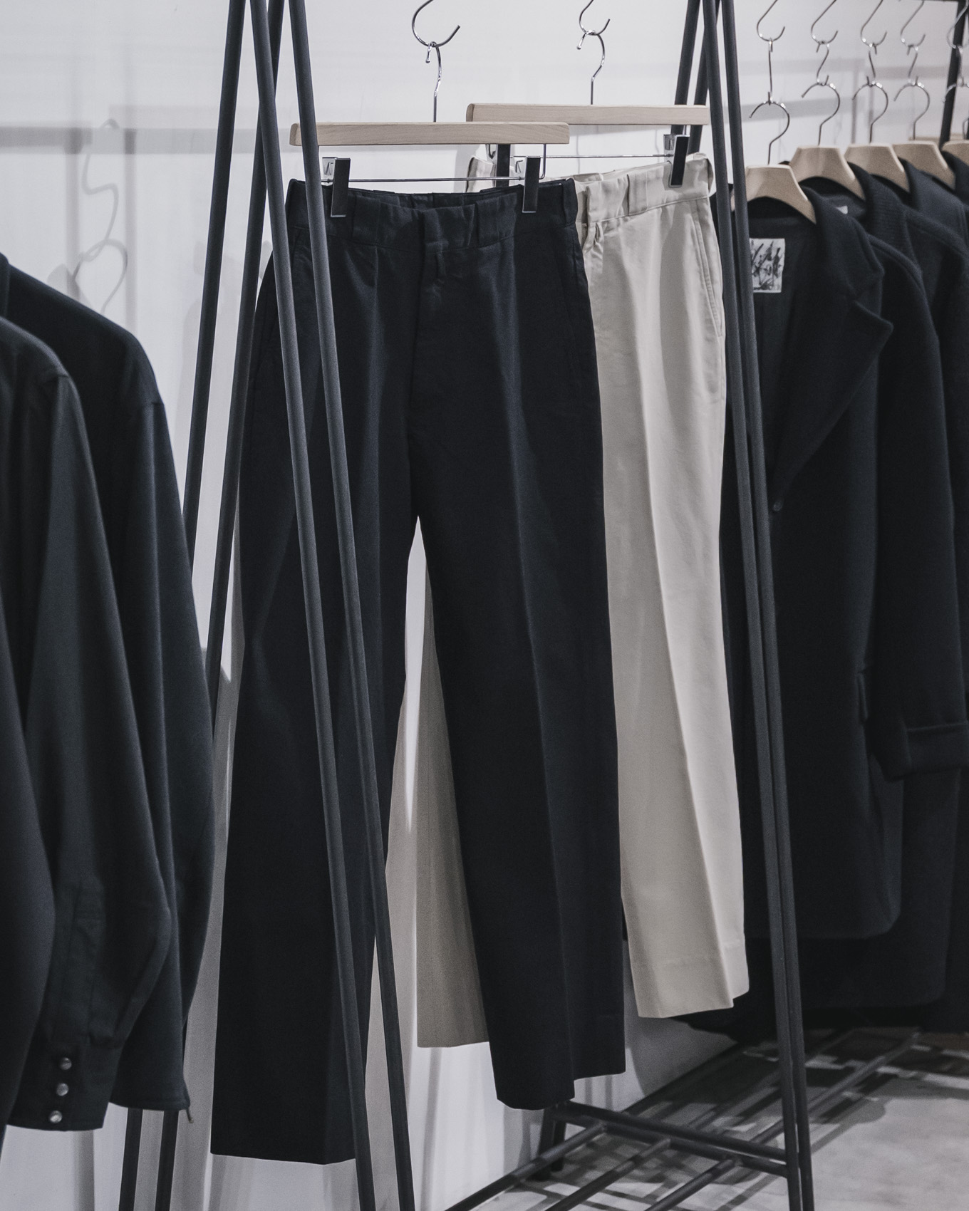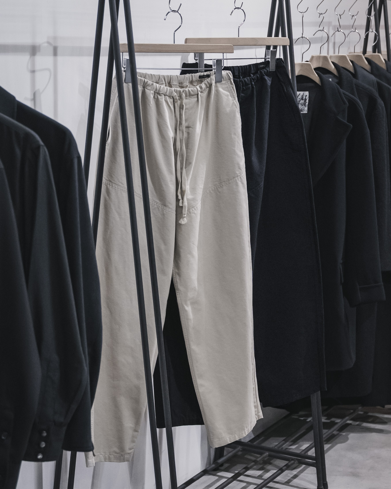 継続モデルとなるポストワークツイルパンツです。25SSシーズンよりシルエットをやや太めに調整。すっきりとした印象を保ちながらも、程よいゆとりのある穿き心地に仕上げています。スラックスほど堅くならず、かといってカジュアルにも寄りすぎない、絶妙なバランス感が特徴の一本です。シンプルにシャツやニットをサラッとあわせる感じがお勧めです。