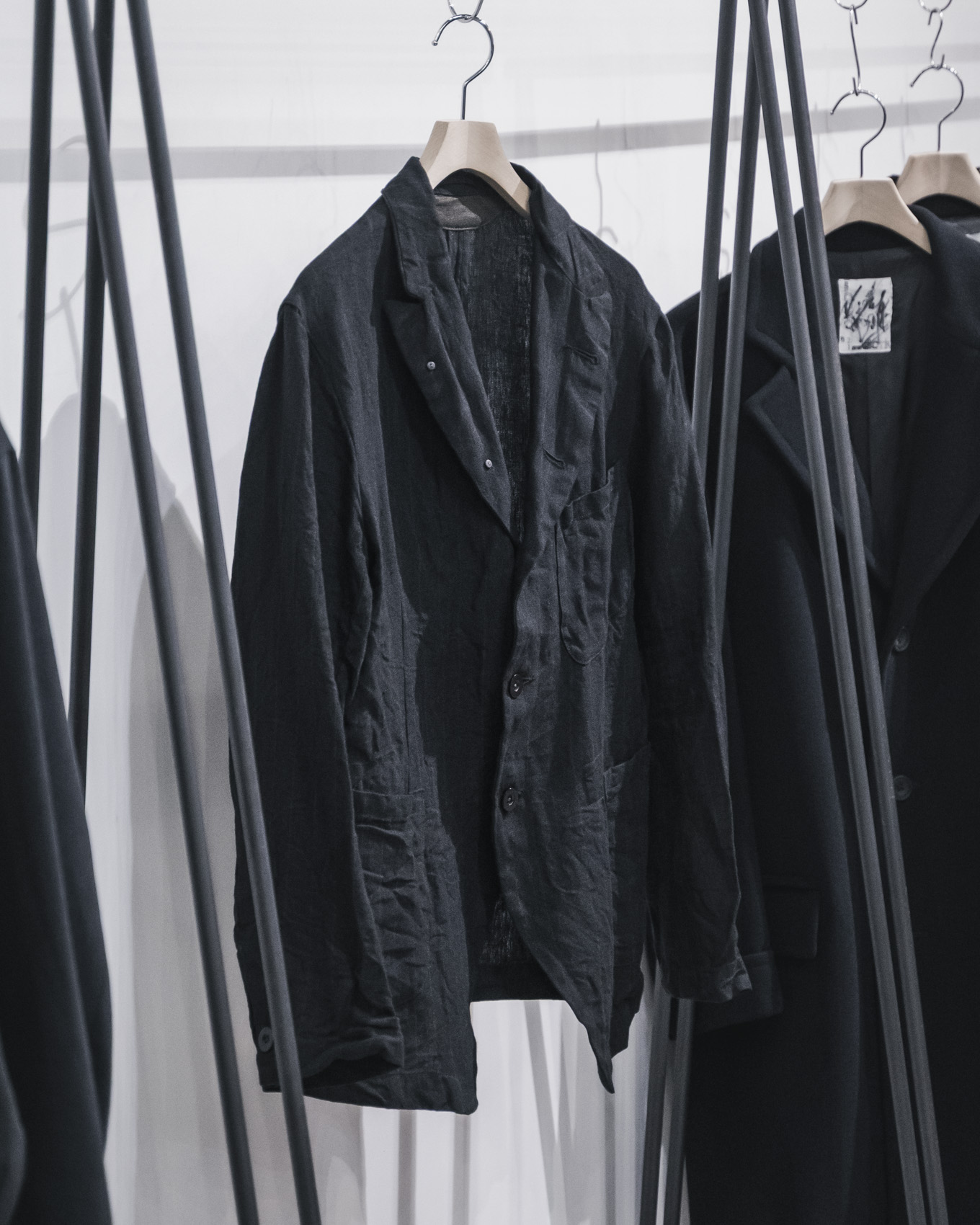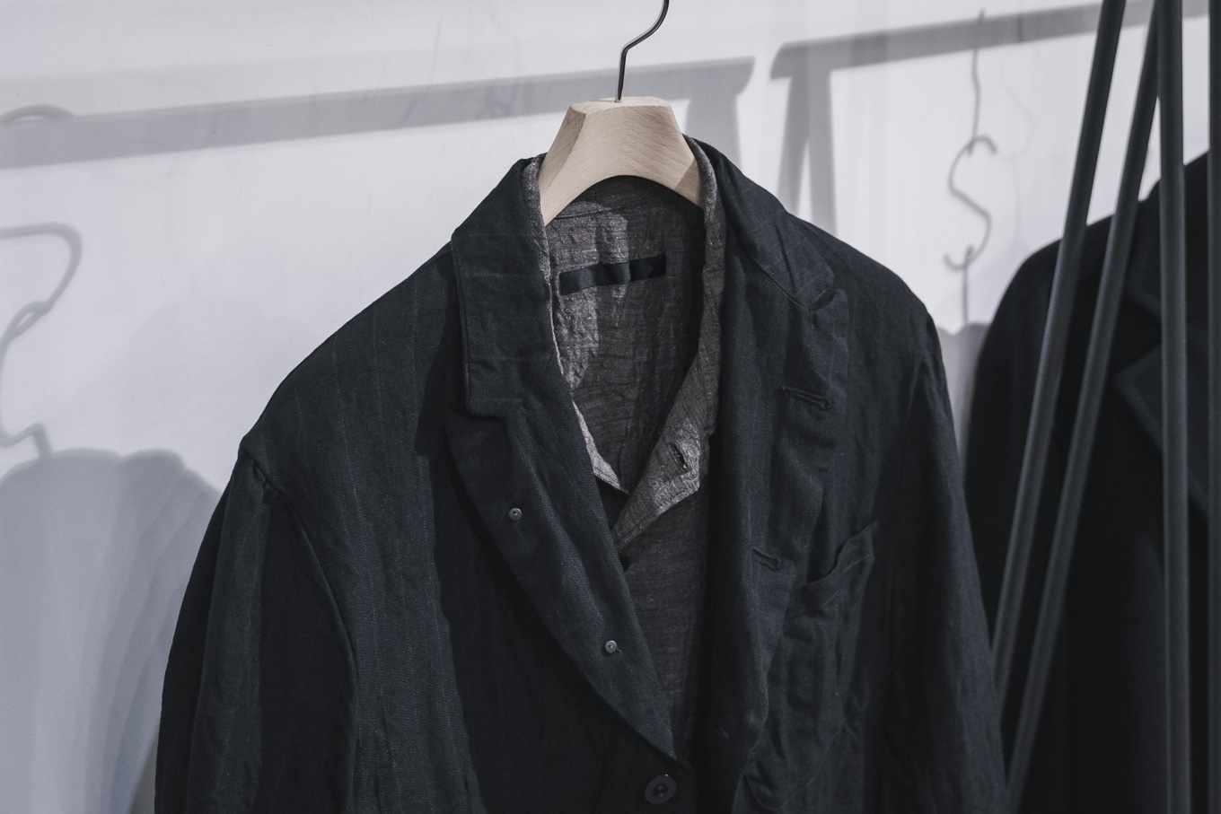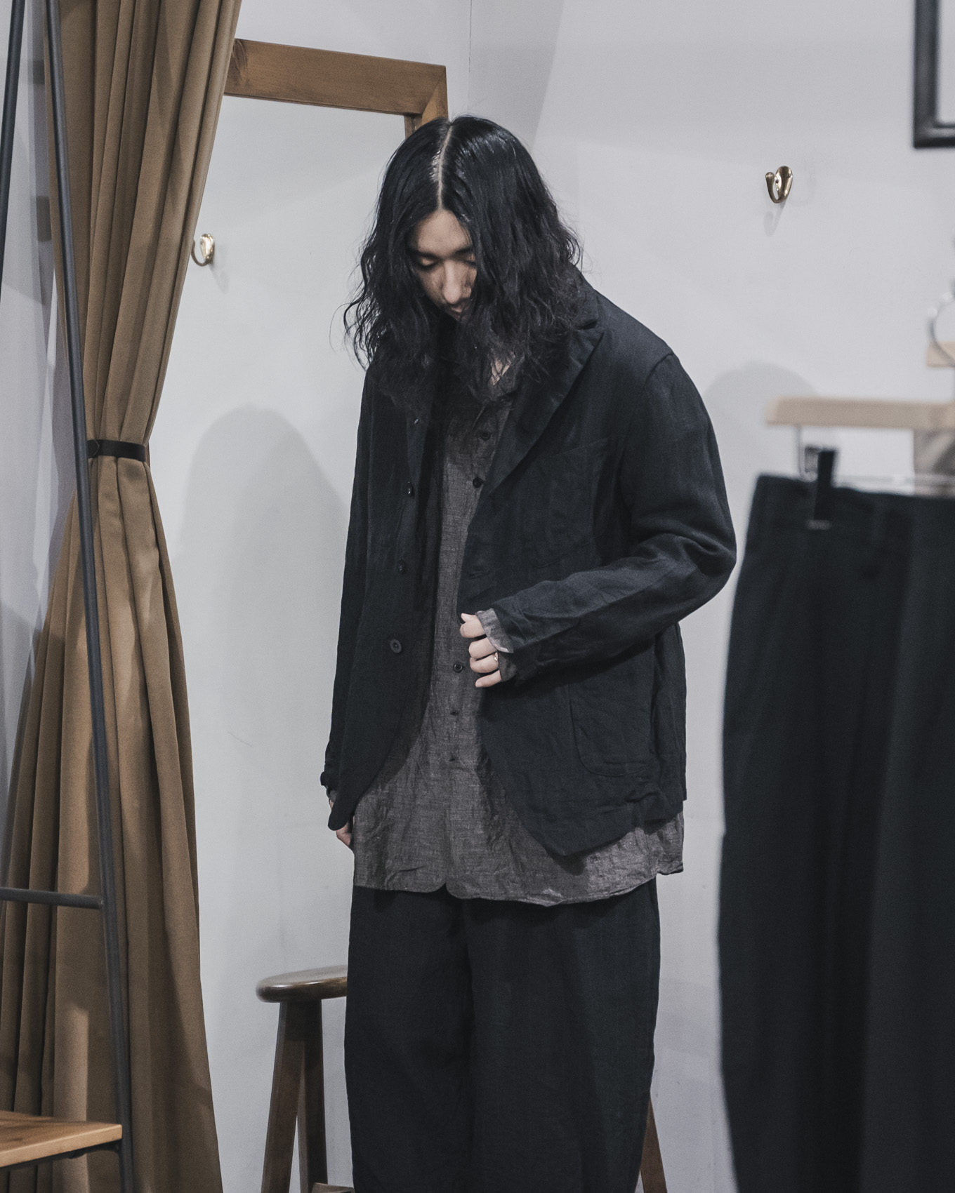 襟元をボタンで留めて着用することもできる特徴的なパターンワークによってデザインされたジャケットです。襟周りのパターンは、1920-30年代のものを参考にし、引き締まった雰囲気を醸し出します。クラシカルな雰囲気を纏ったアイテムですが、製品加工を加えることで、リネン特有の柔らかな風合いを兼ね備えたアイテムに仕上がっており、シャツジャケット感覚で羽織りやすいのも特徴の一つです。