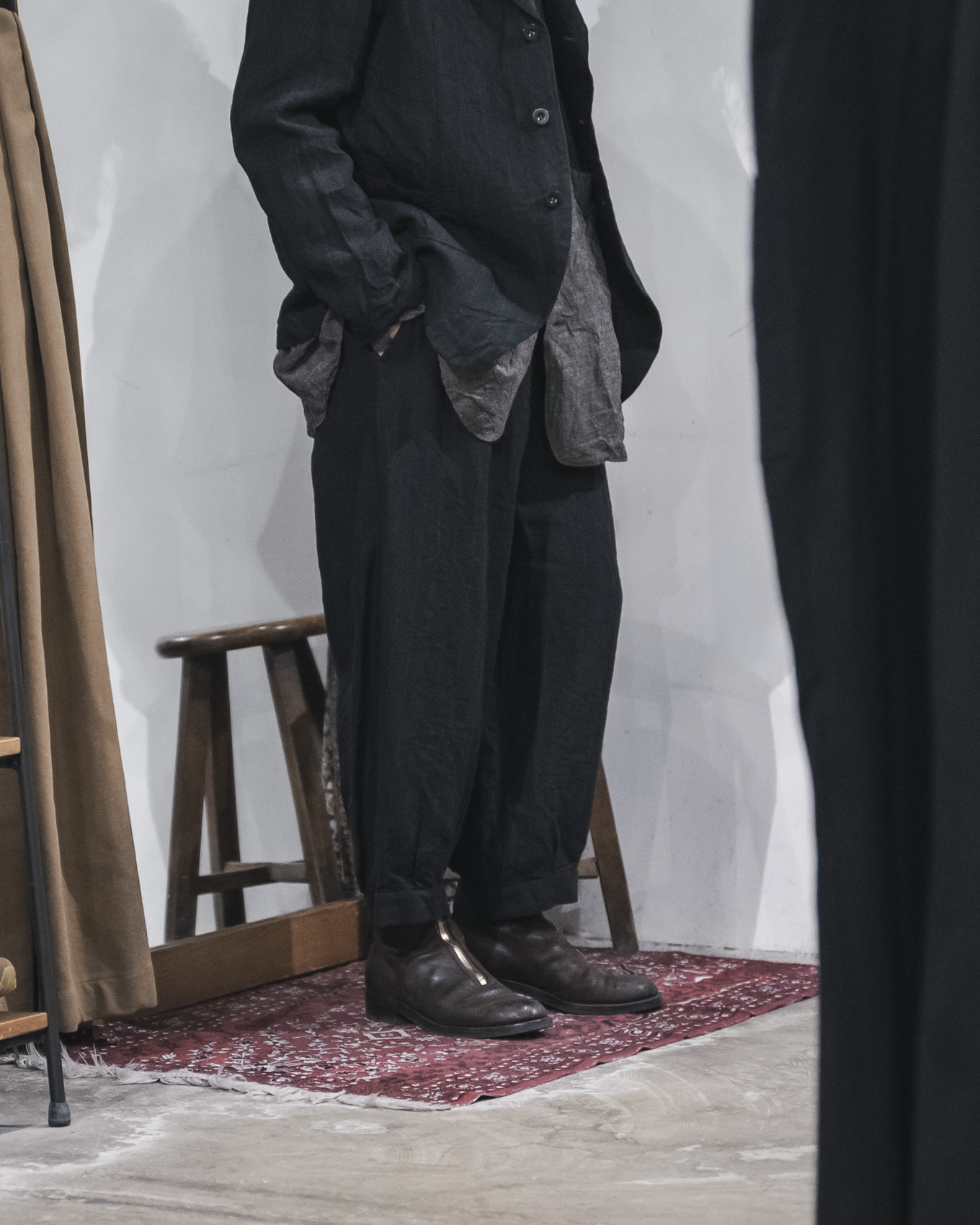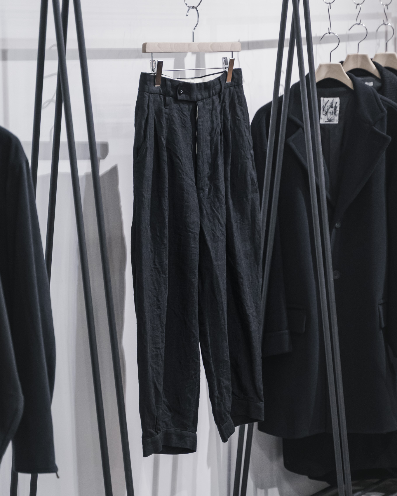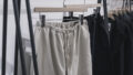 特徴的なシルエットでありながら、着合わせてみると様々なトップスとの相性が良く、春夏の軽快なスタイリングのアクセントとなるようなテーパードシルエットのボトムスです。素材は上記のジャケットと同じで、奥行きを感じられる底深い色調が魅力のストライプ柄のリネン素材を使用しています。強撚したリネン素材をヘリンボーン組織で織り上げることで、素材感の力強さを感じられますが、軽やかな生地感となっており、ドレープとハリが共存する生地に仕上がっています。