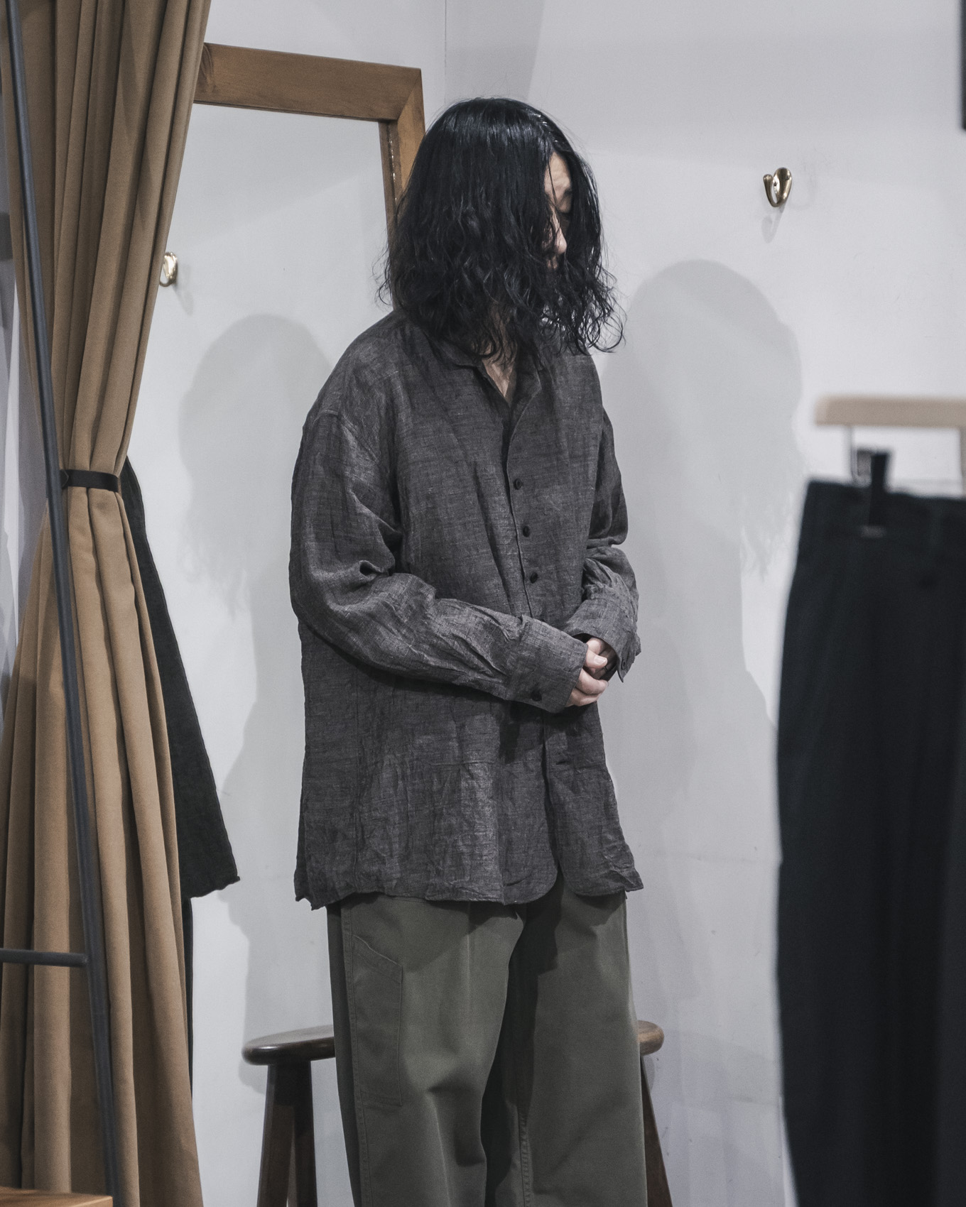 アームホールや身幅、着丈など全体的にゆとりのあるサイズバランスで製作しながら、襟は19世紀半ばに流行したクラブカラーを採用し、ヴィンテージライクな雰囲気に仕上げたシャツです。素材は、東洋とも西洋とも見える古い色調を目指したリネンを使用したシャンブレー生地で、太番手糸を程よく甘織りで織り、仕上げに製品加工を施すことで、空気を含んだかのような軽やかな生地感に仕上げています。