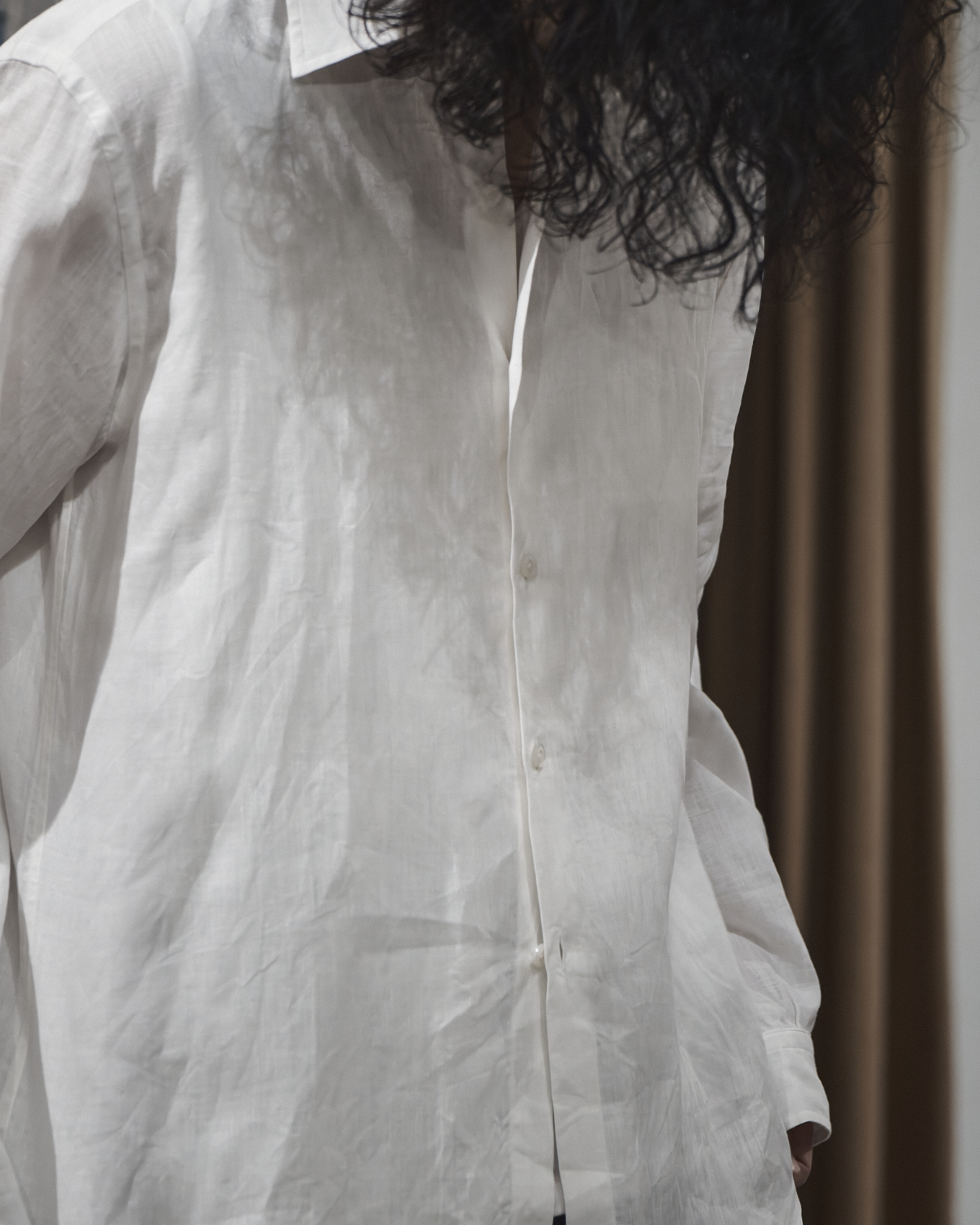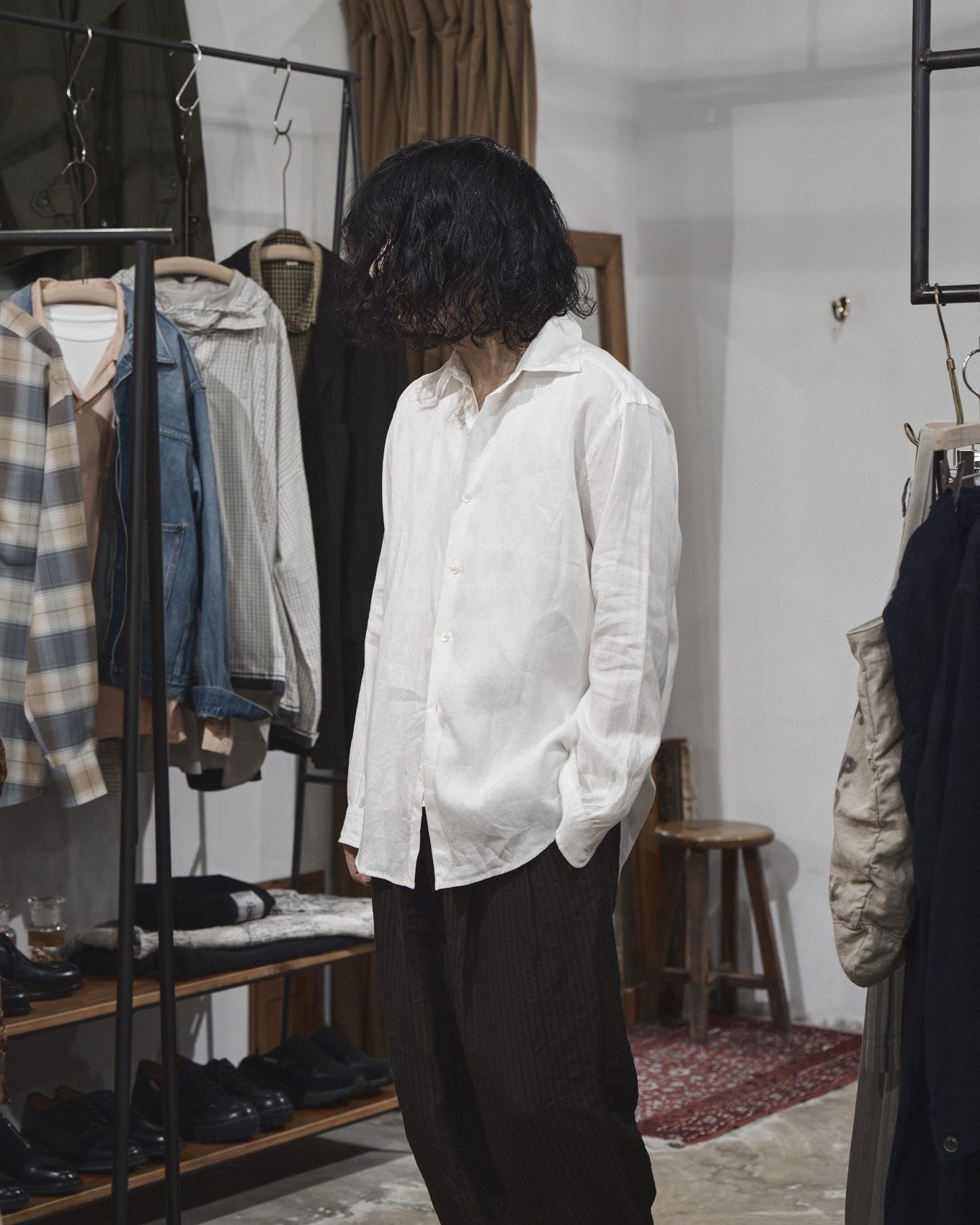 近江上布の流れを汲む、オーセンティックなリネン平織り生地を使用したシャツです。細番手の糸で織り上げた、薄手で軽やかな素材感が特徴です。ウインザーワイドカラーを採用し、上品で抜けのあるバランスに仕上げています。着用を重ねることで滑らかさが増し、柔らかく肌触りの良い生地へと変化していきます。リネン特有の風合いと上質さを併せ持つ、育てるリネンシャツです。袖を捲ってラフに合わせる着こなしも様になります。