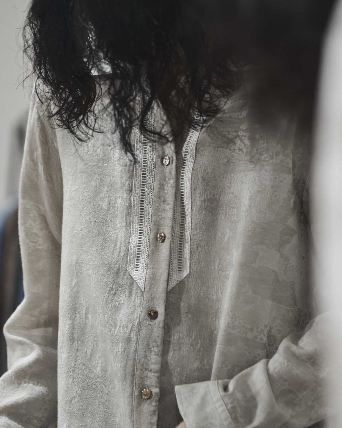 20世紀を代表する女性画家、フリーダ・カーロの作品から着想を得た、モスグリーンのジャカード生地を使用したオープンカラーシャツです。キュプラとコットン、レーヨンを交織し、淡い色味の中に浮かぶ花柄が独特の表情を生みます。1930年代のナポリのオープンカラーシャツをベースに、キューバシャツの要素や綿レースを加えたデザインです。落ち着いたトーンの総柄で、軽やかなスタイルにも自然と馴染みます。