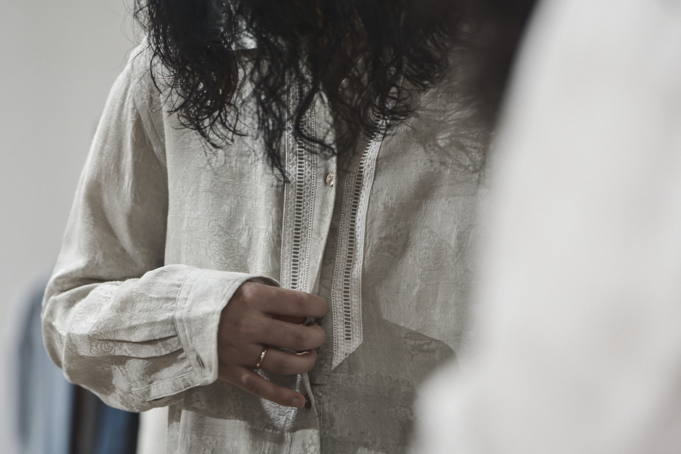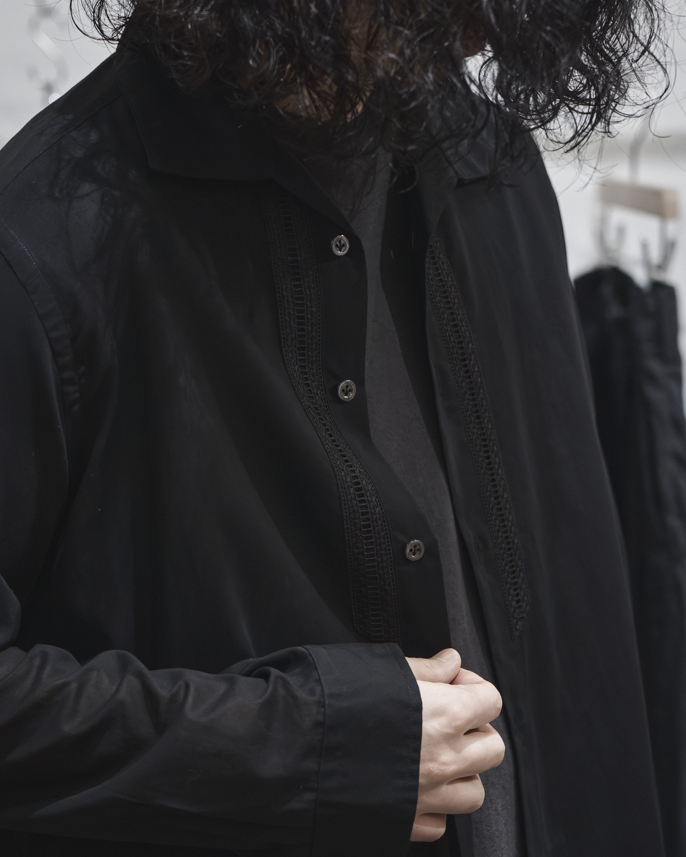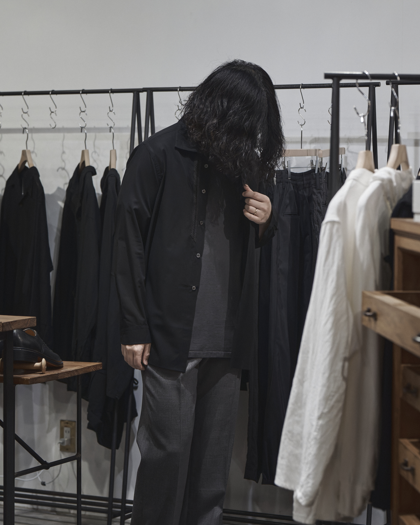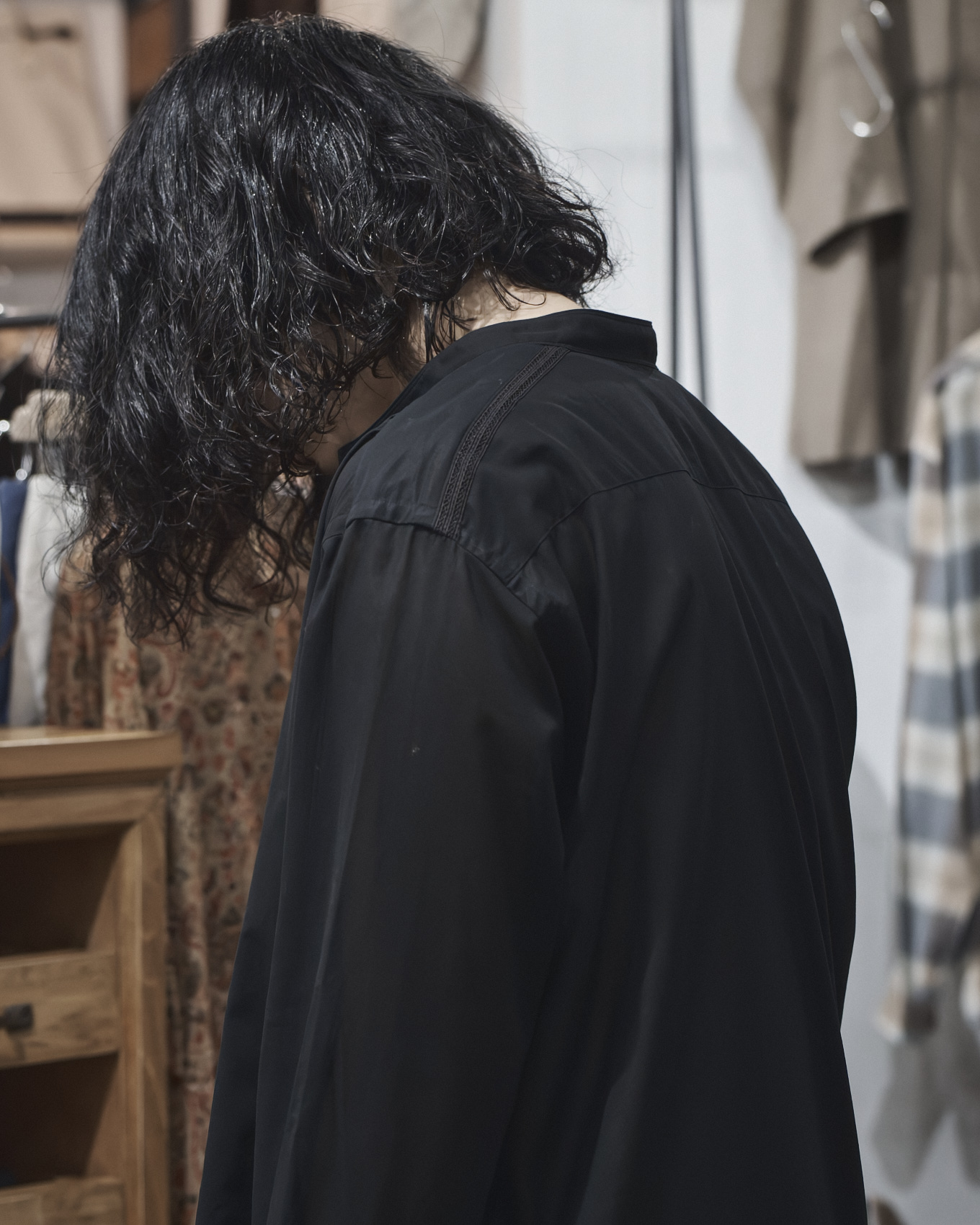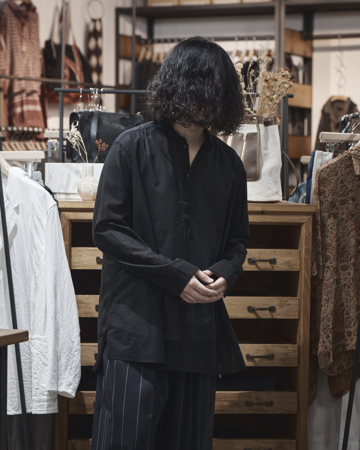 前記と同型の生地違いになります。こちらは、モノトーンのワードローブでファッションアイコンとしても名高い女性画家ジョージア・オキーフのモノトーンスタイルから着想を得て選定された、シースルーボイルコットンを使用しています。強撚糸を用いた繊細で滑らかなタッチと、程よい透け感による軽やかな表情が特徴です。風になびく美しいドレープと黒の色合いが、軽快でありながらもしっかりとした雰囲気のスタイルを生み出します。スラックスにサンダルを合わせた軽やかなスタイルにさらりと羽織るのもおすすめです。