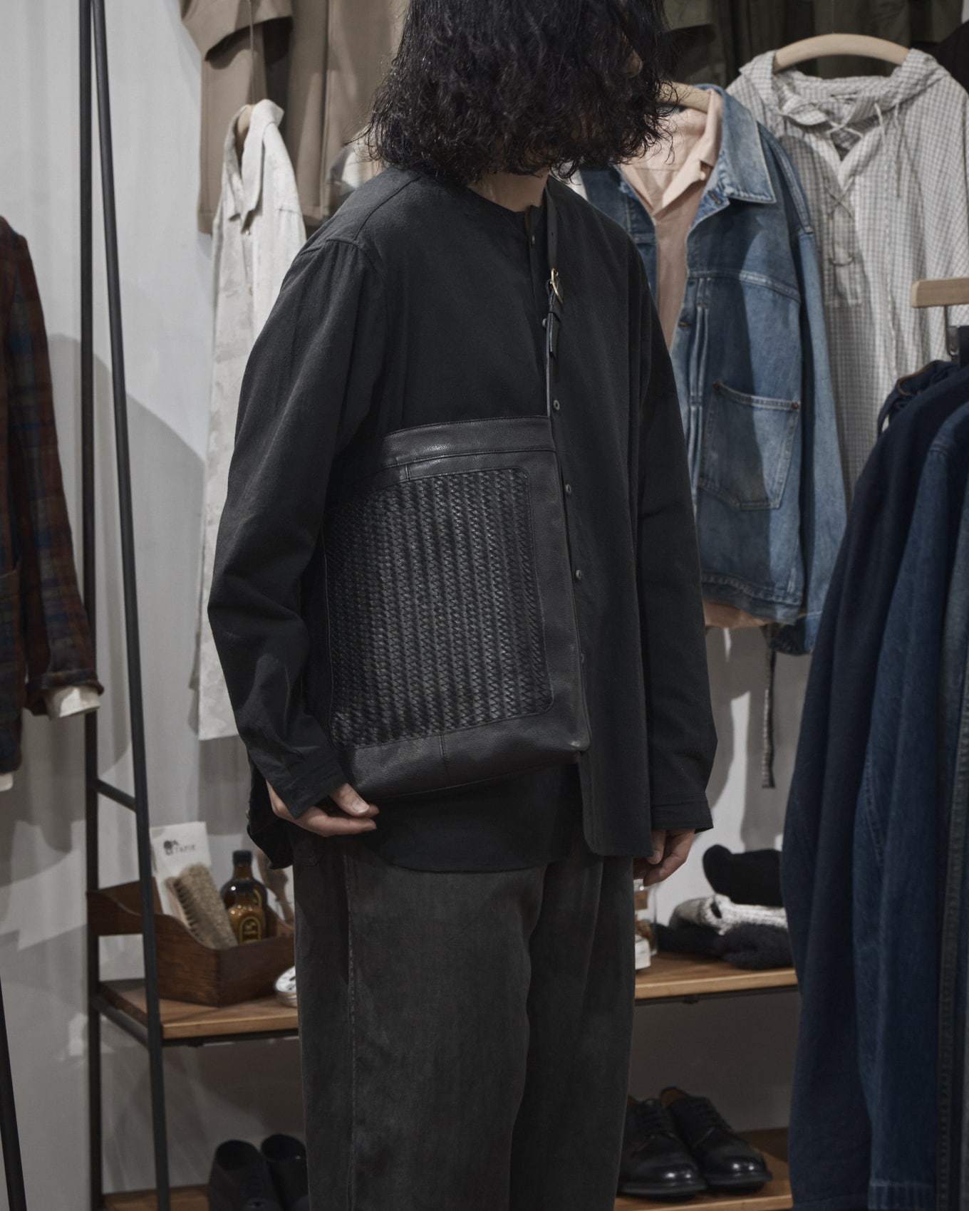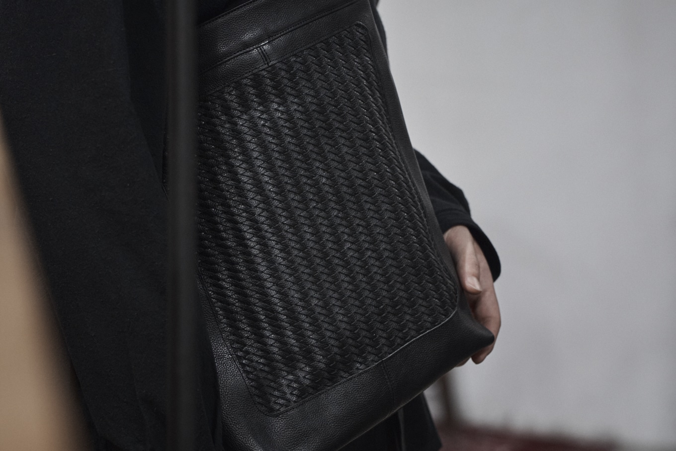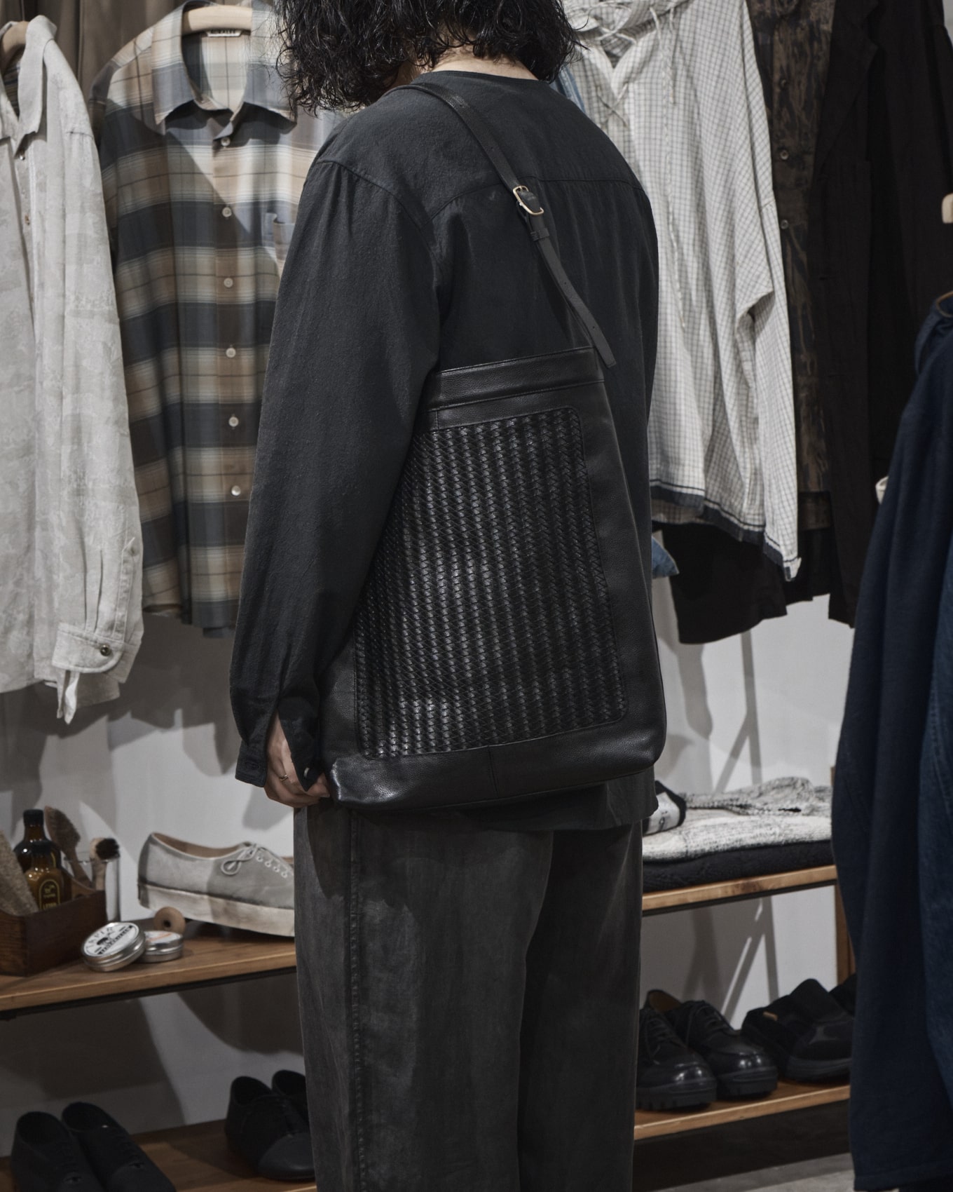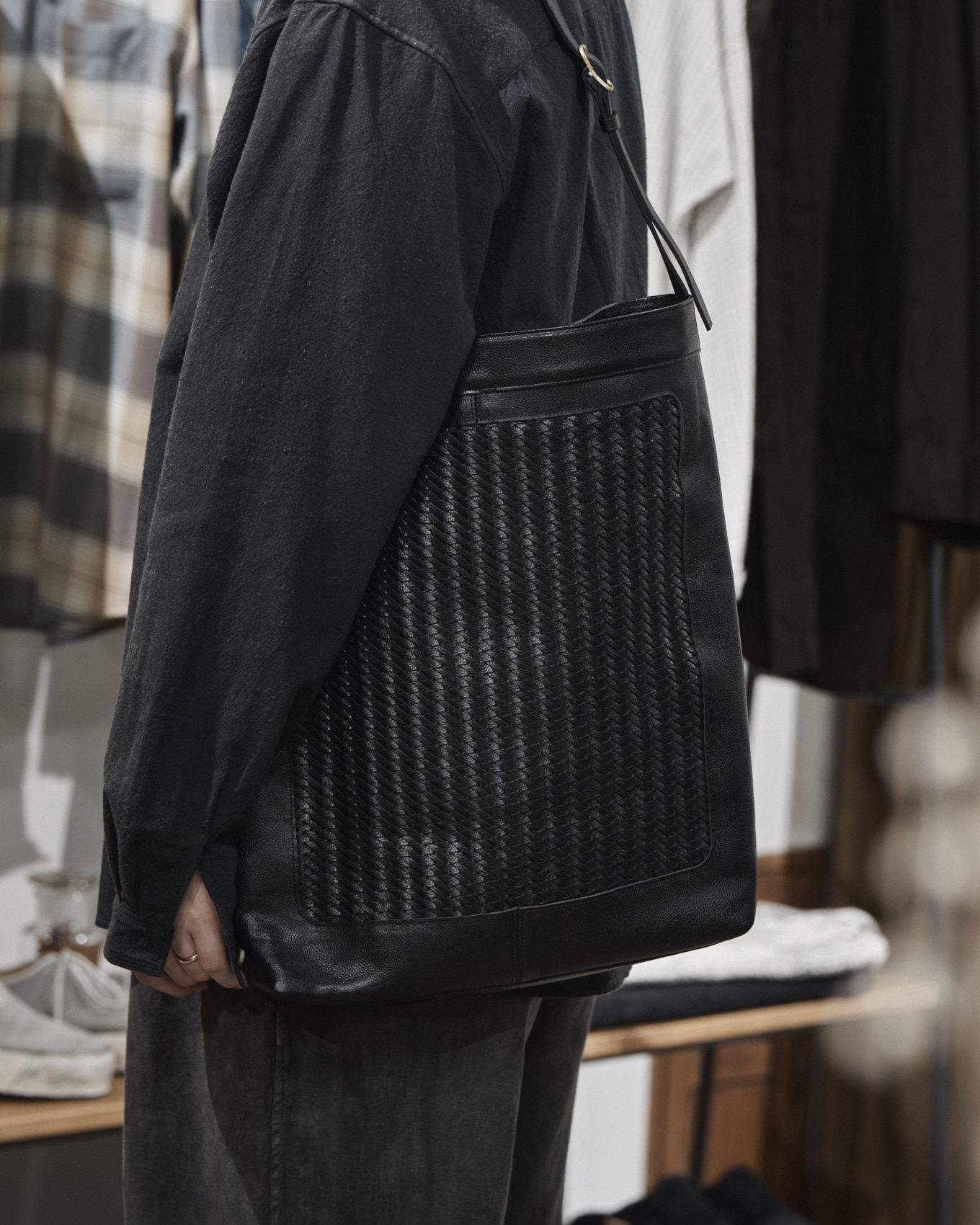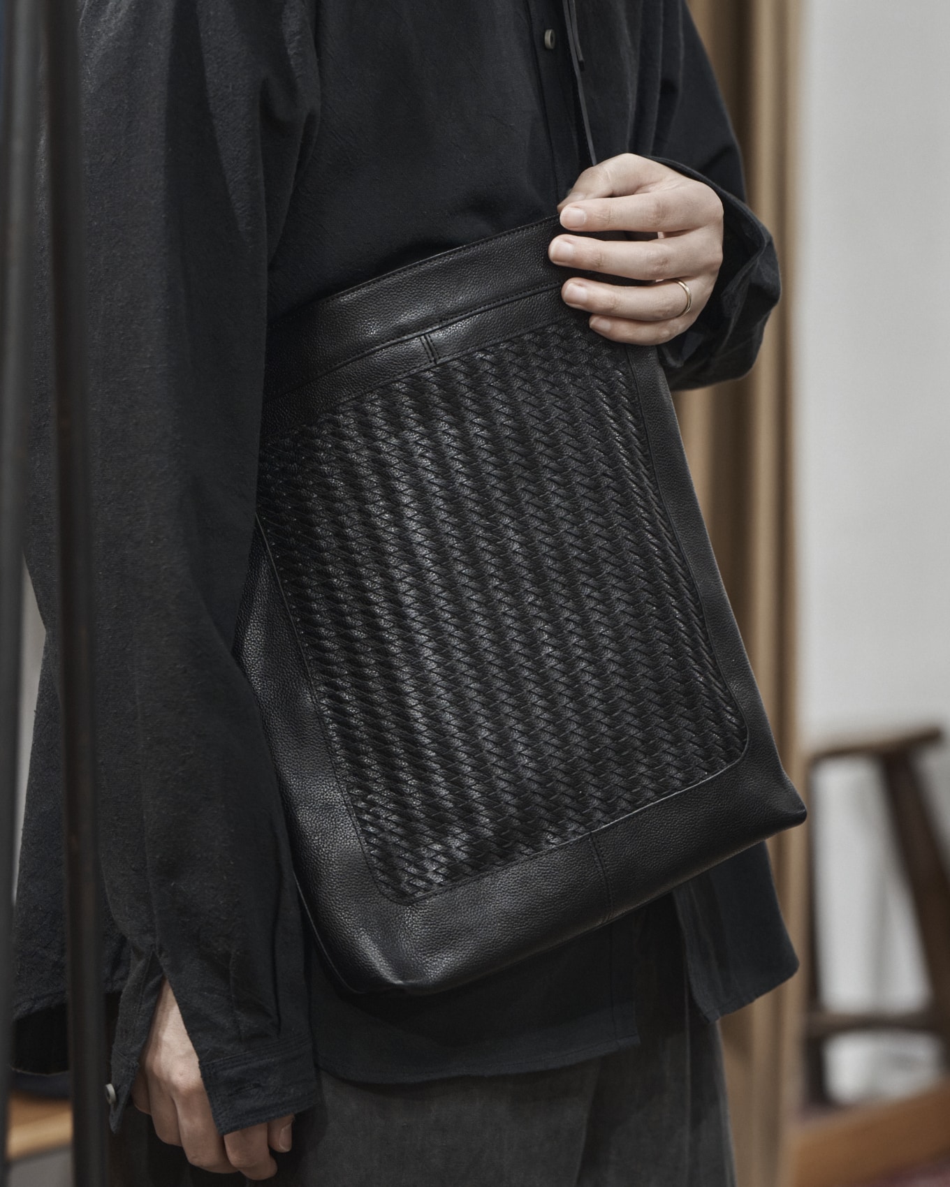 手で編み上げたメッシュレザーをパネルに配した、縦型のトートバッグです。上質で繊細な美しさを感じられる仕上がりになっています。