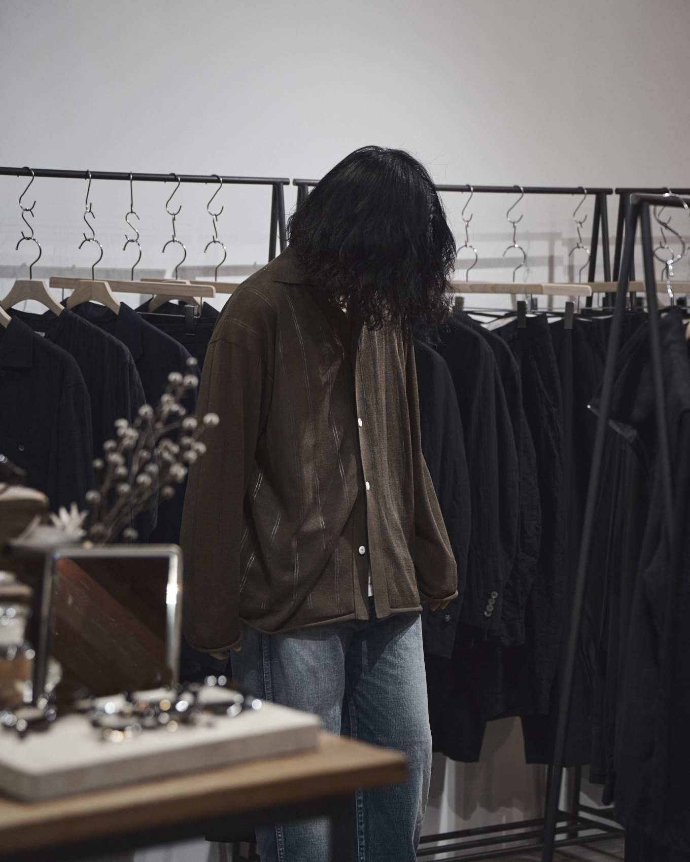品名の通り、非常に強いシャリ感があり、リネンのような清涼感も兼ね備えています。肌離れの良いドライなタッチで、気温が高くなるこれからの時期も、薄手のインナーやタンクトップの上から快適に羽織っていただけます。