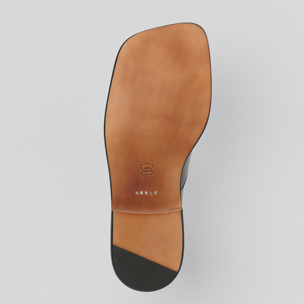 ウェルトのエッジもラストのフォルムに沿って、角を落とし、控えめな丸コバに仕上げています。実際に足を入れるとラストのインパクトを感じつつも、ワイドシルエットのボトムスなどに馴染みやすいシューズに仕上がっています。