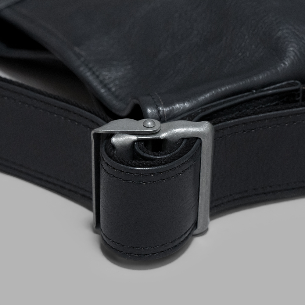 ショルダーストラップの長さは調整が可能で、古いミリタリーバッグに使用されていそうな大ぶりのアジャスターが付きます。手提げで持つ時は、ストラップを中のバッグに収納することもできます。開口部は真鍮のフック留めの仕様です。中はコットンの総裏でしっかり仕立てられ、大きめの内ポケットを1つ付けています。