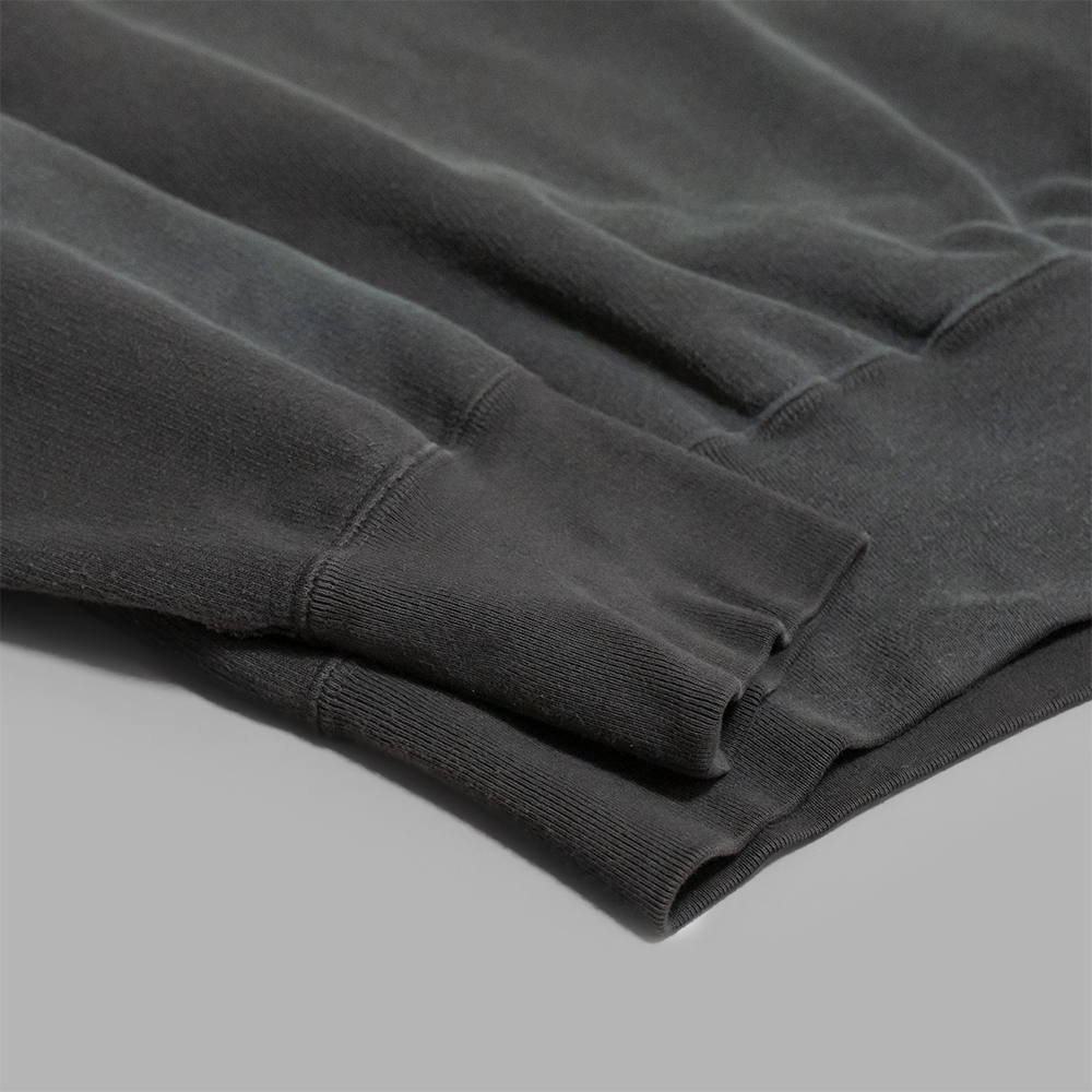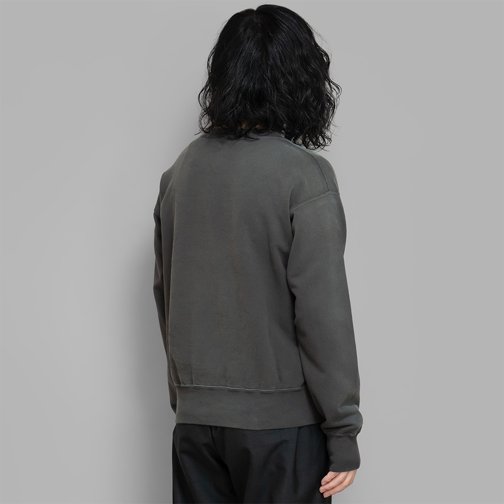型は、裾のリブがやや強めに窄まることにより、メリハリのあるシルエットが生まれるプルオーバースウェットです。縫製後に製品染めをすることにより、長年使い込んだかのような深みのある色味に仕上げていることもポイントです。