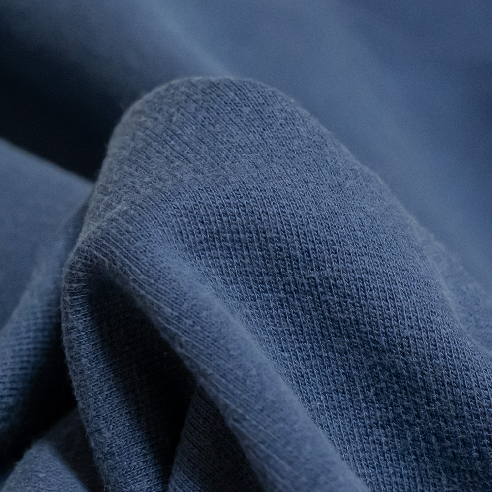 素材は、表糸には超長綿のピマコットン、裏糸には弾力のある空紡糸を採用し、高品質な原料とヴインテージ機械を最大限に活かしたスウェット素材を使用しています。独特の薄さと弾力を兼ね備えた、軽やかでありながらも豊な素材が特徴です。