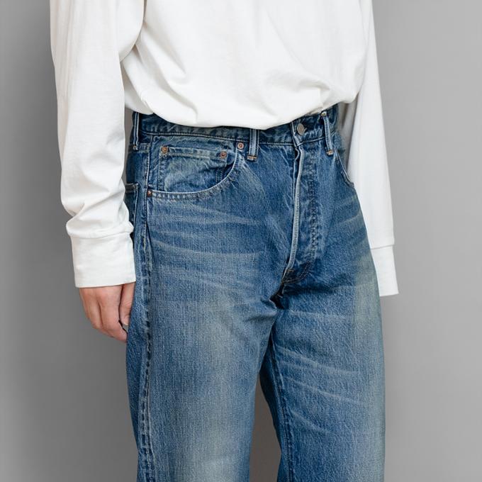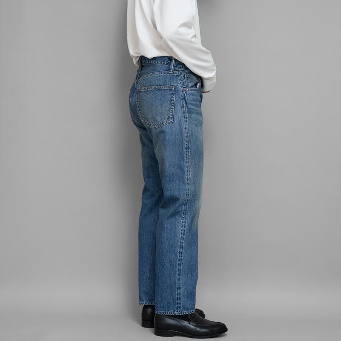 長年穿き込んだ、少し薄めの経年変化を加工で再現しています。カジュアルにも上品なスタイリングにも適したバランスの良い1本で、Teeシャツやスウェットなどのカットソーからテーラードジャケットまで幅広く対応できる汎用性の高さを備えています。