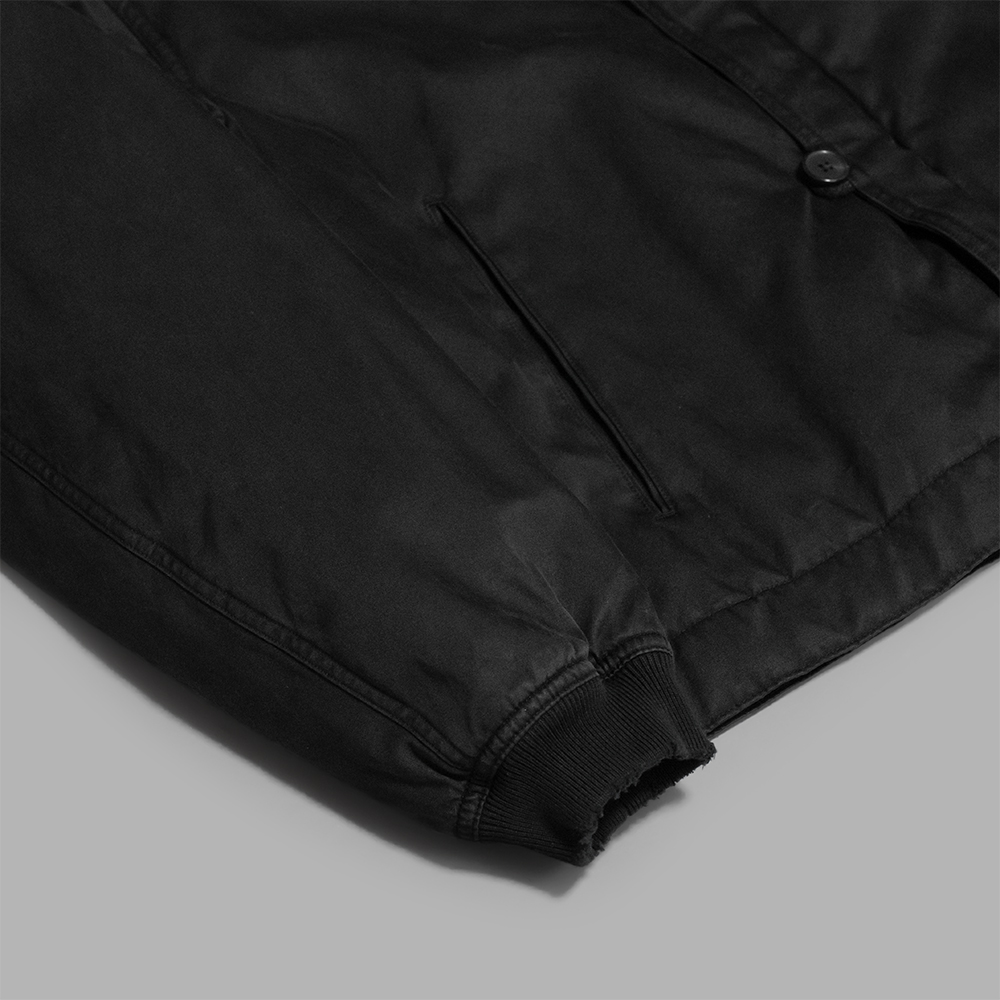 半世紀以上のナイロンの経年変化を、シルクの特徴を活かして、一点一点、職人の手作業で汚れや色の変化を表現した加工も特徴の1つです。程よくフェードした色合いが、アイテムの雰囲気をより一層高めています。絶妙な色差のある黒のワントーンコーデや上質なウールスラックスとのあわせから、ヴィンテージ加工の施されたデニムやコットントラウザーとのあわせまで、様々な着こなしを楽しめます。