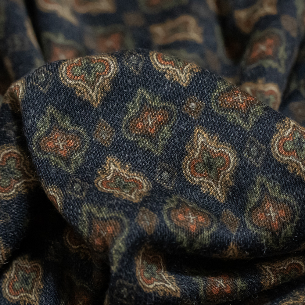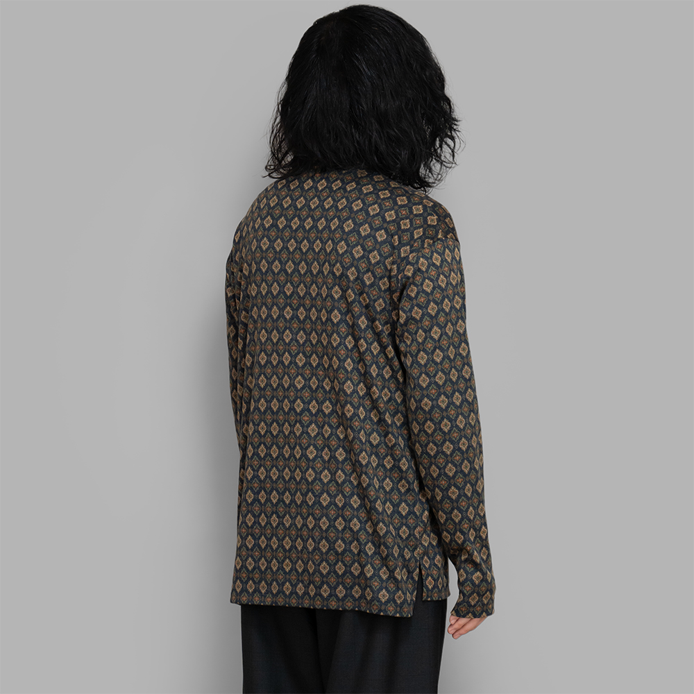 型は、ブランドで定番アイテムとして展開されている、ハイネックのカットソーです。様々なアイテムのインナーとして着用しやすいよう、タイト過ぎないサイジングで製作されています。また、ネクタイで使われるようなクラシックな柄なので、派手さがありつつも、クラシックな雰囲気で着用いただけます。