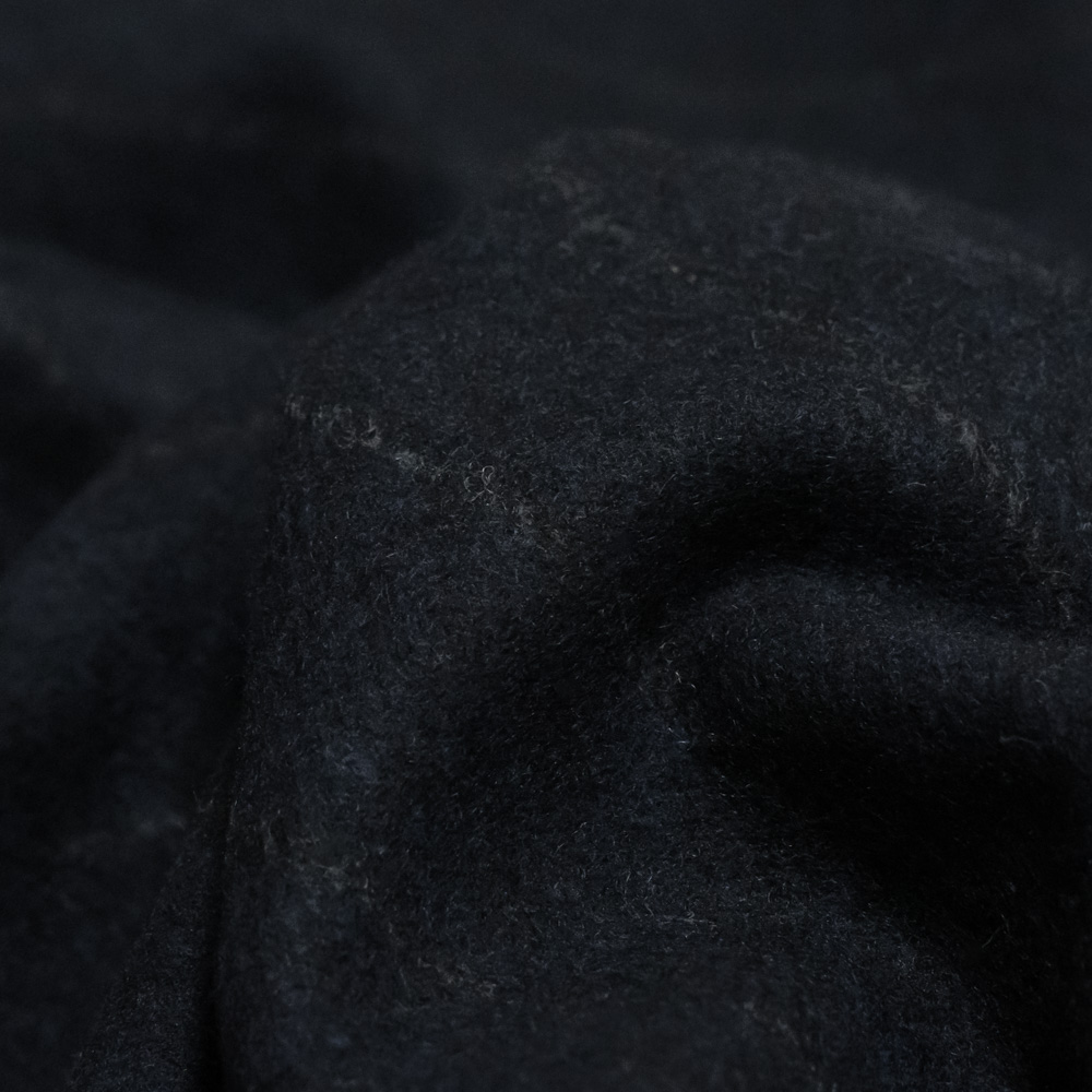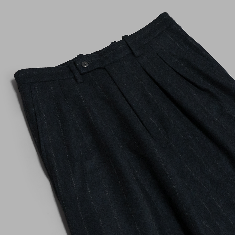 ウールの混紡素材で作製されたフランネル生地を使用しています。ベーシックな綾織とトラディショナルなピンストライプを融合させ、程よく起毛加工を施すことにより、柄がぼやけて、チョークストライプのような見え方へと変化しています。且つ、冬場に履ける厚みをもたせつつ、しなやかで柔らかな質感を兼ね備えていることも特徴です。