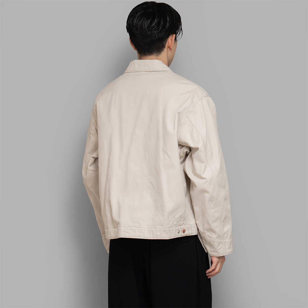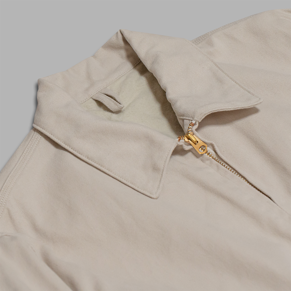 型は、シンプルなジップジャケットで、袖と身頃の脇部分を、トリプルステッチで縫製し、ワークジャケットのような雰囲気にデザインしています。袖口と裾のアジャスターは、スナップボタン留めの仕様です。中はコットンネルの総裏で、内ポケットを2つ付けています。