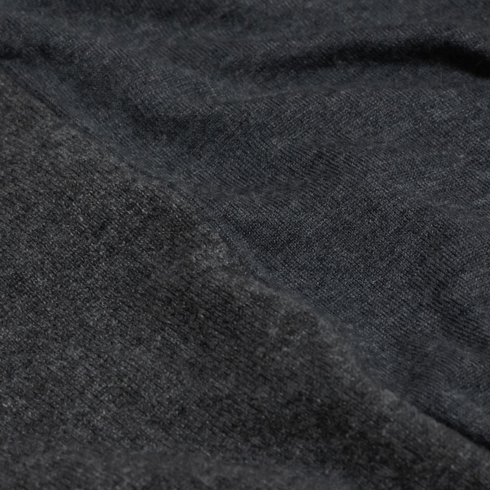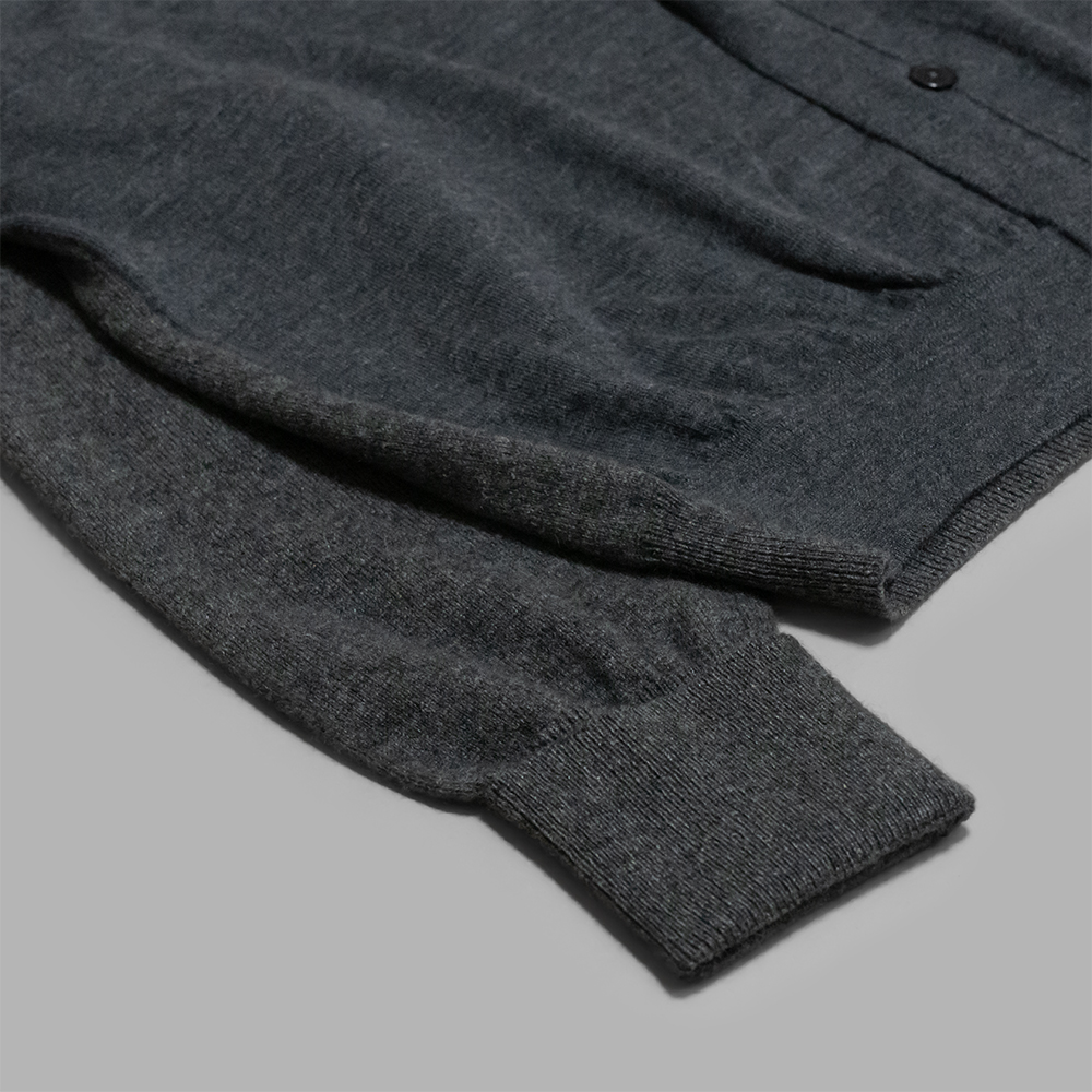 素材は、ハイゲージで綺麗に編み立てられた、なめらかで風合いの良いカシミヤを使用しています。前身頃には、繊維を平行に引き揃え、均一な編み地が特徴的な梳毛糸を使用し、袖と後身頃には、短い繊維を撚り合わせて製作した、程よい起毛感とふっくらとした風合いが特徴的な、紡毛糸を使用しています。同色の糸にはなりますが、異なる種類の繊維を使うことにより、風合いだけでなく、わずかな色の変化も楽しめます。