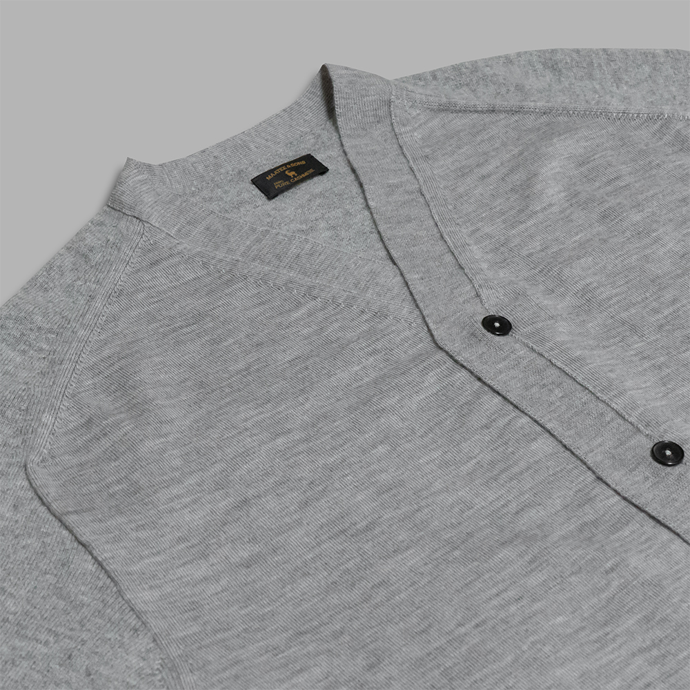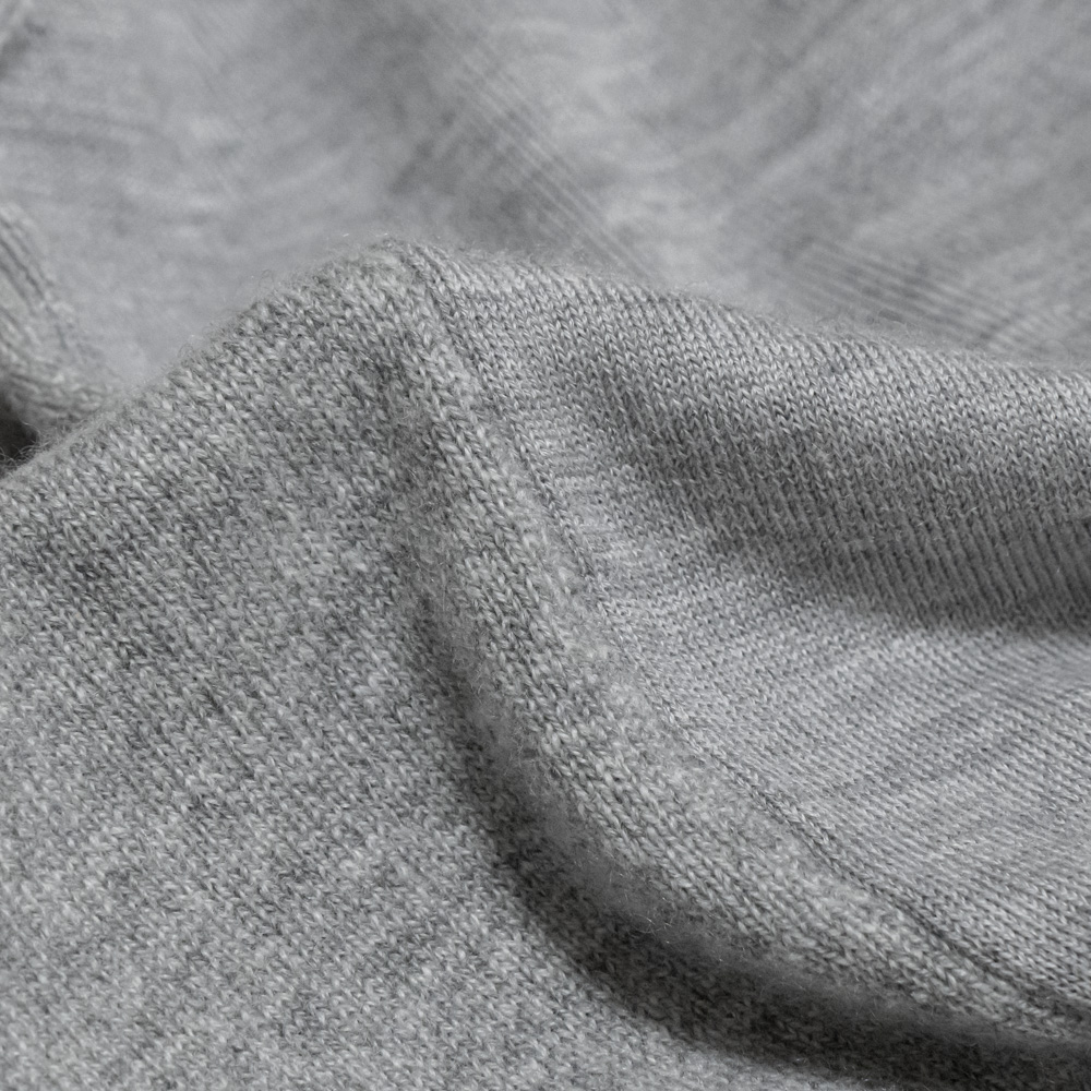 素材は、ハイゲージで綺麗に編み立てられた、なめらかで風合いの良いカシミヤを使用しています。前身頃には、繊維を平行に引き揃え、均一な編み地が特徴的な梳毛糸を使用し、袖と後身頃には、短い繊維を撚り合わせて製作した、程よい起毛感とふっくらとした風合いが特徴的な、紡毛糸を使用しています。同色の糸にはなりますが、異なる種類の繊維を使うことにより、風合いだけでなく、わずかな色の変化も楽しめます。