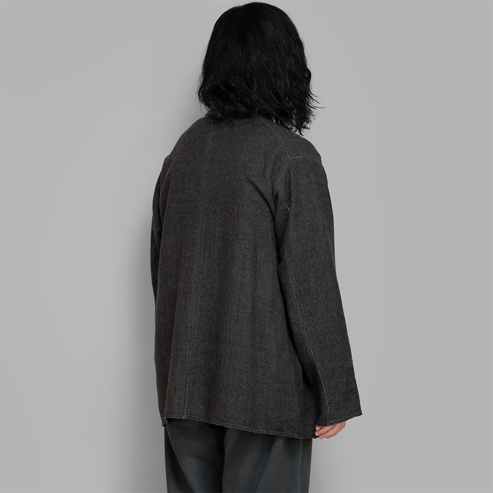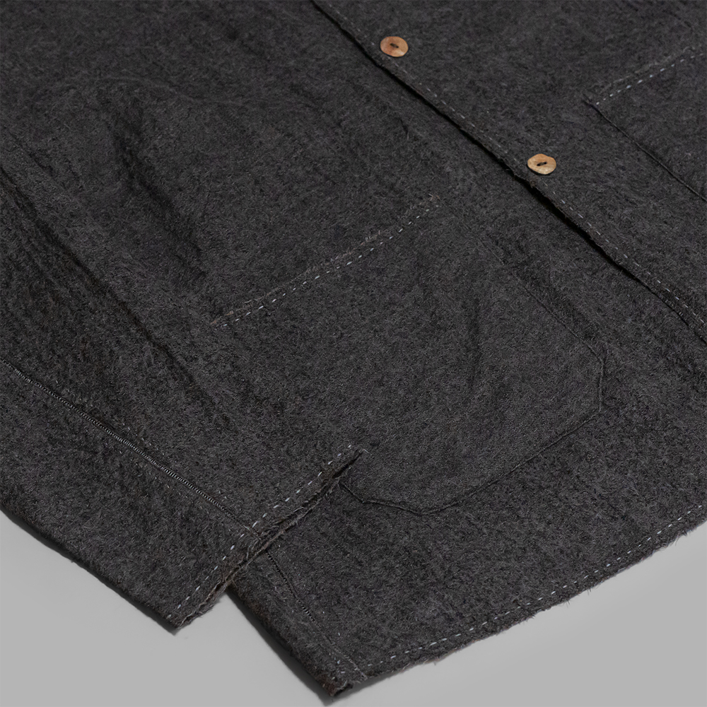 随所に散りばめられた、手縫いならではのステッチは、機械生産には無い温かみや、独特の風合いを感じられる特別な一着となっています。加えて、秋冬通して着られる、汎用性の高さも魅力の一つで、生地の凹凸により、厚みがあるようにも見えますが、着心地はとても軽いため、秋口はシャツジャケット感覚でサラッと羽織ることができます。気温が徐々に下がってきたら、インナーに薄手のニットなどを着たり、冬場は、カーディガン感覚で、コートの中にあわせることも可能です。