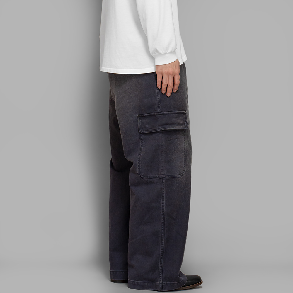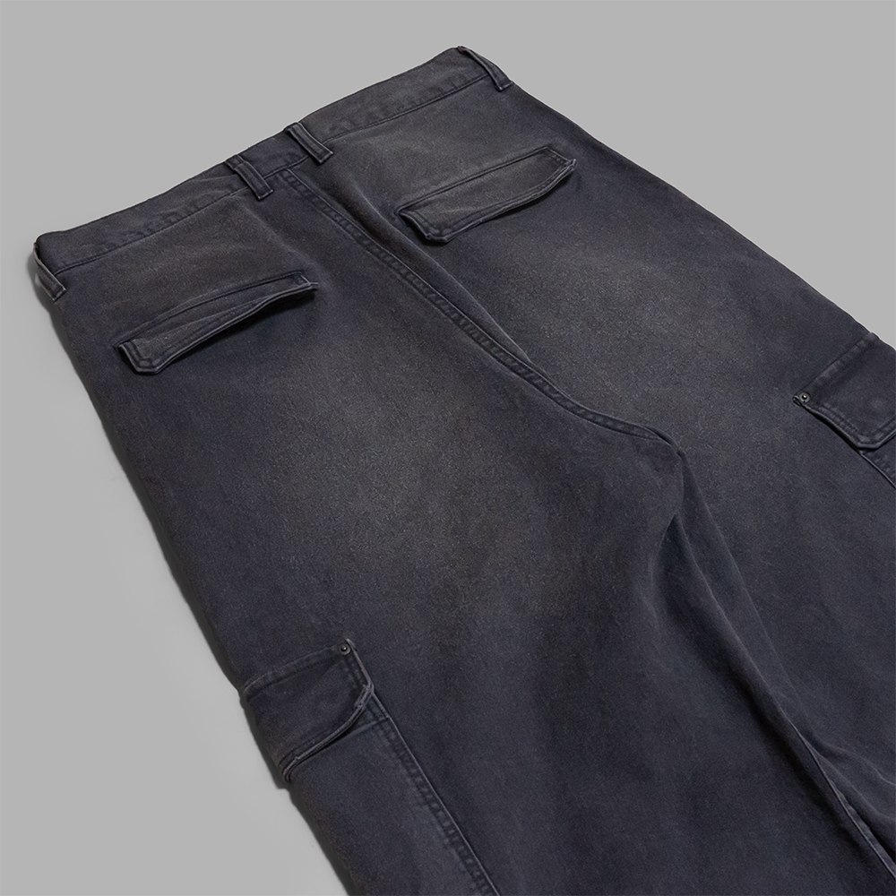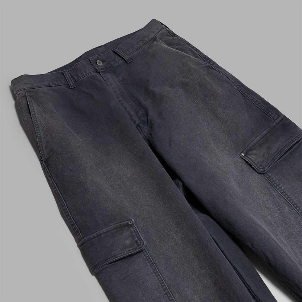 型は、ワタリから裾まで真っ直ぐに落ちた、綺麗なワイドストレートシルエットが特徴のカーゴパンツです。股上を深く設定することで、リラックスした印象を与えるだけでなく、股周りにも余裕ができるため、ストレス無く着用することができます。細部の仕様は、フロントポケットのフラップや裾のアジャスターなど、一般的なカーゴパンツに見られるディティールを排除し、シンプルにデザインしつつ、逆に、カーゴポケット部分のフラップには、小ぶりのリベットを打ち込み、デザインのバランスを取っていることも特徴の一つです。前立てはジップフライの使用です。