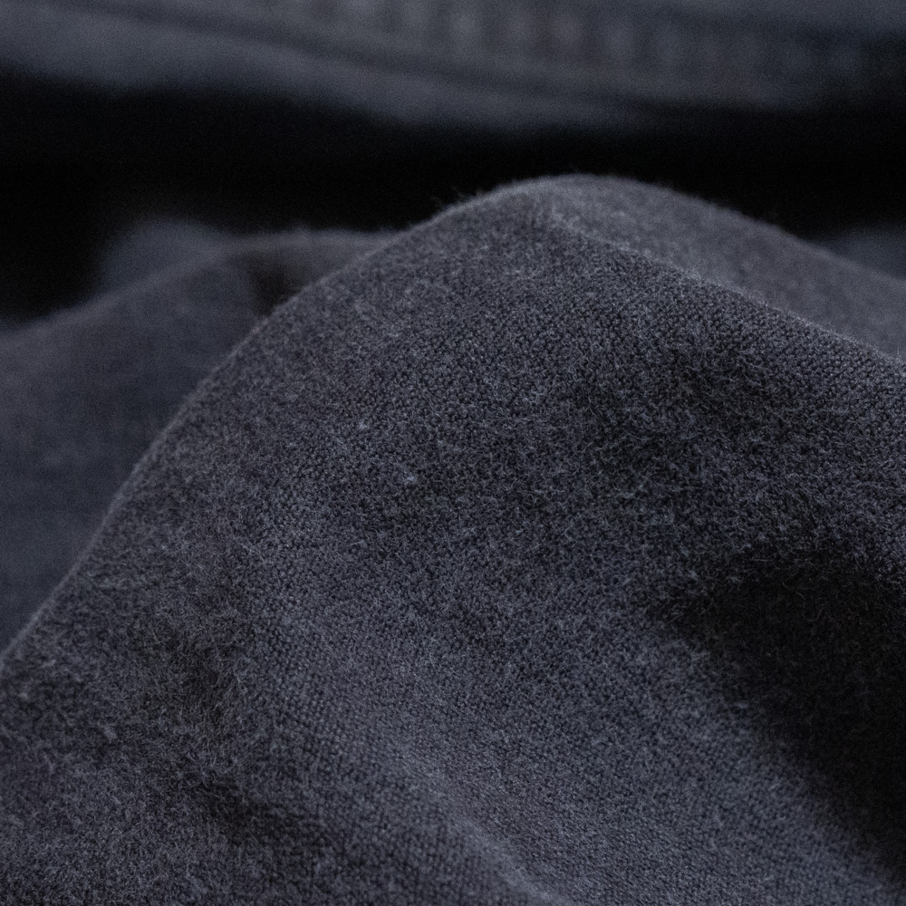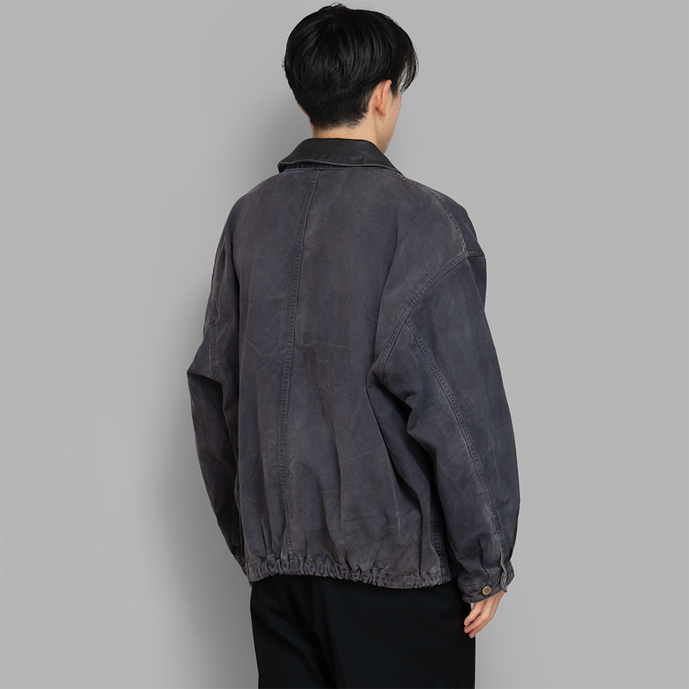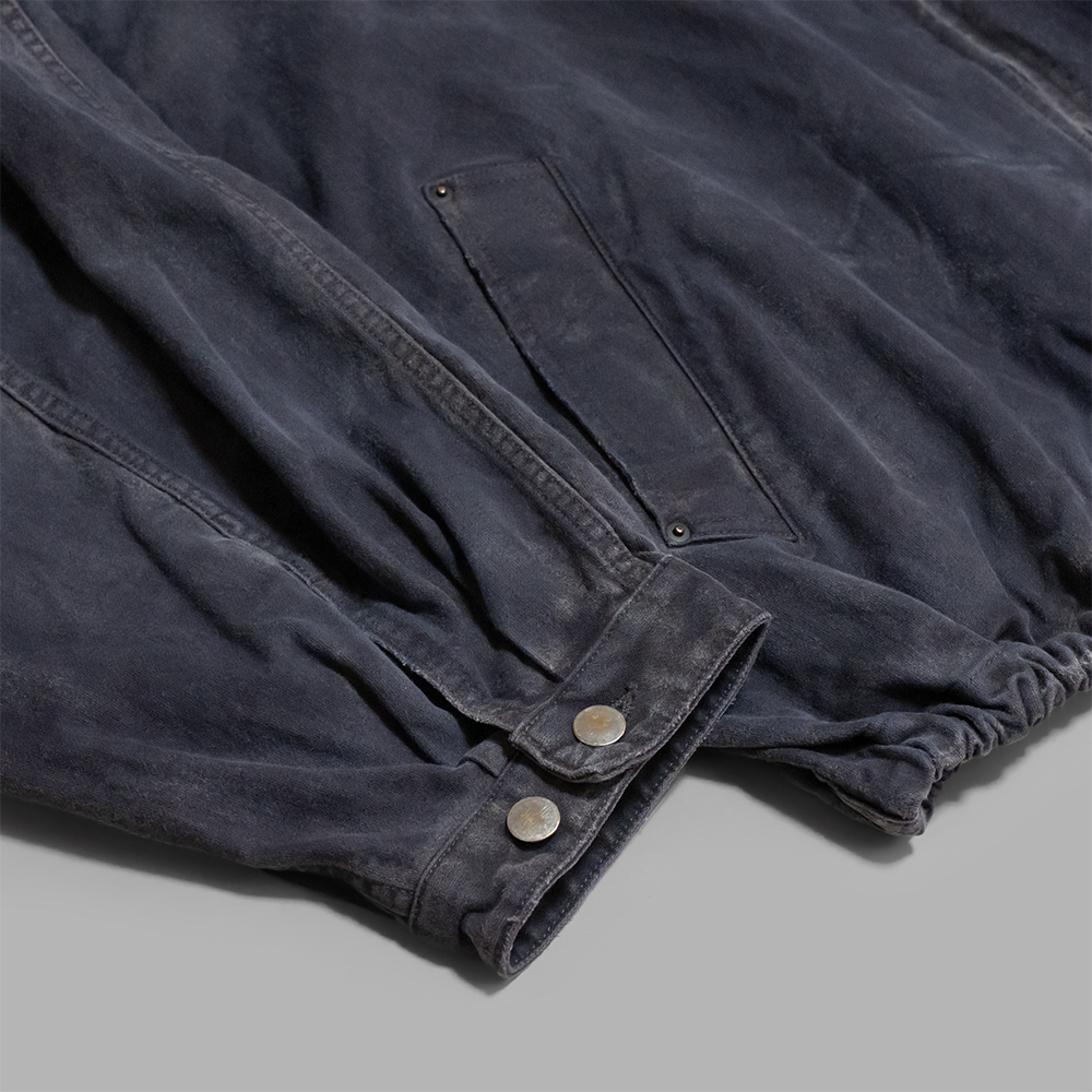 素材には、コットンを綾織りにして製作した、ウィップコード生地を使用しています。厚手で丈夫な生地のため、コートやワークジャケットなど、丈夫さが求められる衣類に用いられ、太い綾目の畝が立体感を感じさせる生地です。また、硫化染めを施したウィップコード生地に、ブリーチ、製品洗い、吹付け、ダメージと、様々な加工を重ねていき、着古したような独特な表情に仕上げているのも特徴です。
