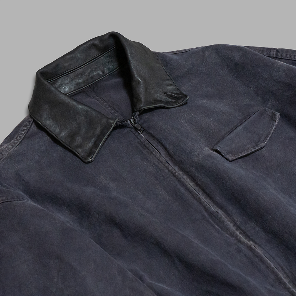 襟の表面には、細かなシボ感のあるシープレザーを使用しており、ファッション性を高めています。さらに、レザー部分にも加工を施し、経年変化を表現することで、ボディとの一体感を高めている点もポイントです。襟元にボタンが付けられているため、襟を立てて着用することも可能です。