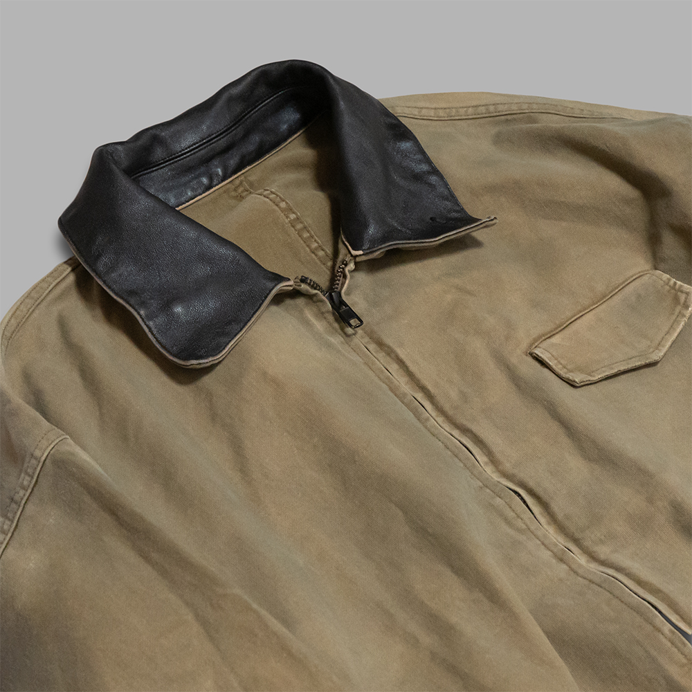 襟の表面には、細かなシボ感のあるシープレザーを使用しており、ファッション性を高めています。さらに、レザー部分にも加工を施し、経年変化を表現することで、ボディとの一体感を高めている点もポイントです。襟元にボタンが付けられているため、襟を立てて着用することも可能です。