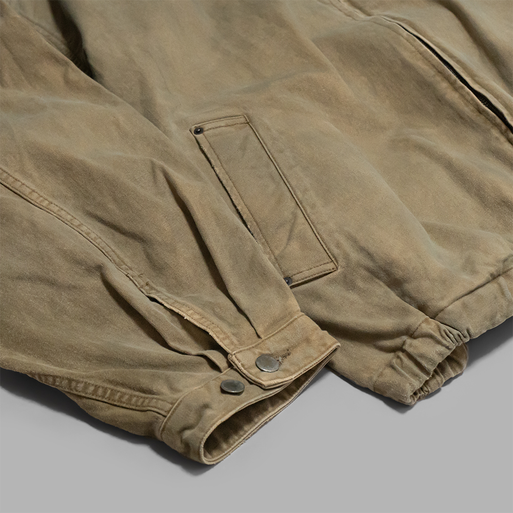 素材には、コットンを綾織りにして製作した、ウィップコード生地を使用しています。厚手で丈夫な生地のため、コートやワークジャケットなど、丈夫さが求められる衣類に用いられ、太い綾目の畝が立体感を感じさせる生地です。また、硫化染めを施したウィップコード生地に、ブリーチ、製品洗い、吹付け、ダメージと、様々な加工を重ねていき、着古したような独特な表情に仕上げているのも特徴です。