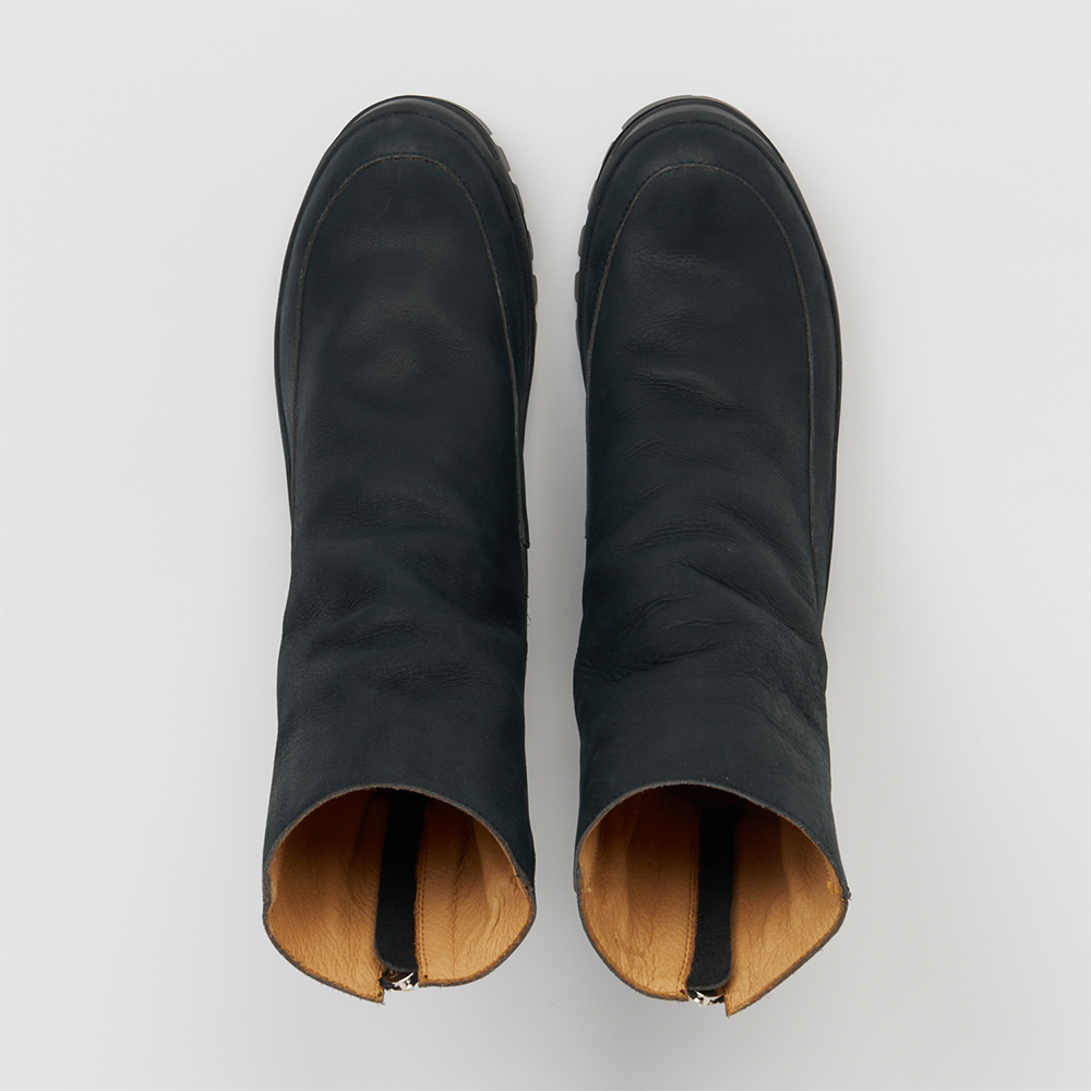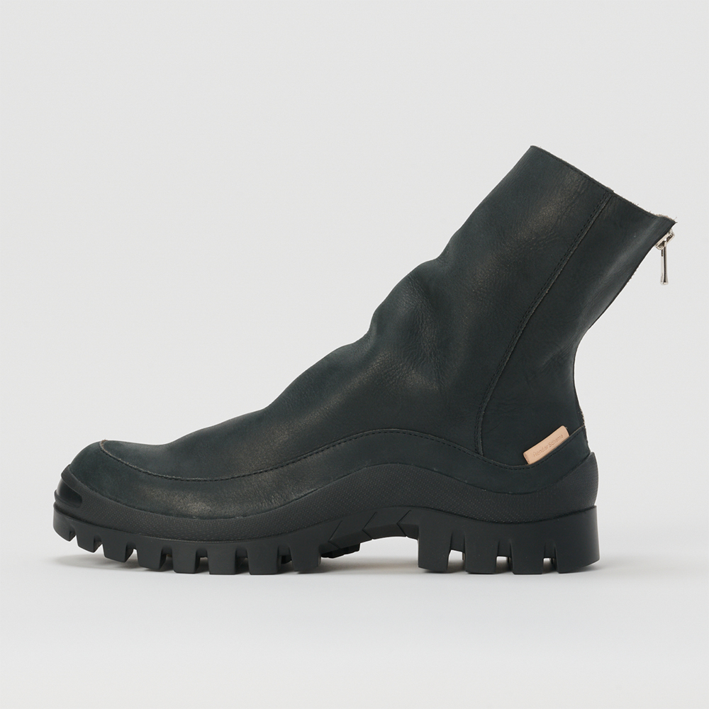 履きこむことで、バックジップブーツの独特なたわみジワが生まれ、唯一無二の表情に変化していくこともポイントです。タフなラバーソールを使用することで、歩きやすさだけではなく、天候にそこまで左右されずに履ける汎用性の高さも兼ね備えています。