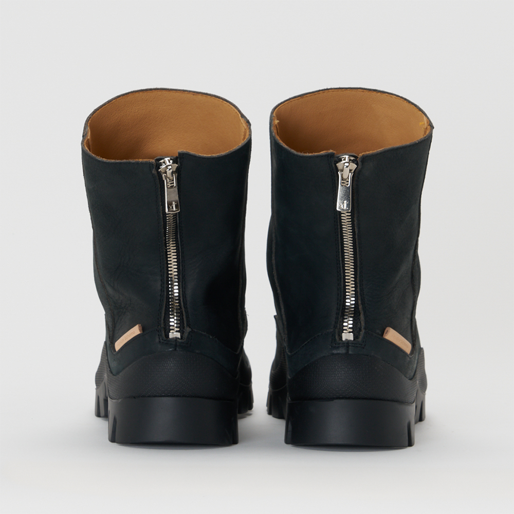 デザインはバックジップのブーツで、甲のパーツは立ち上がりのポイントをあえて作らずに後ろに倒したまま、まとめています。筒の太さもパンツが被ることを想定して細めの設定にして、すっきりとした印象に仕立てています。
