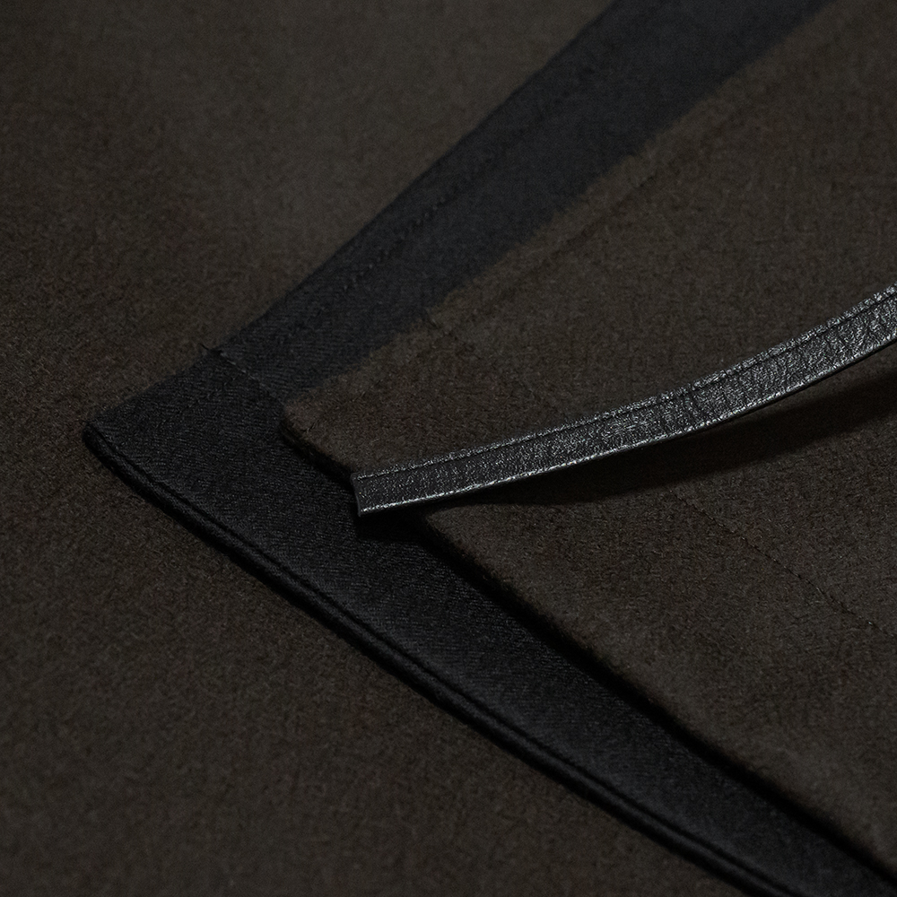 型はダブルブレストのロングコートをベースに、ゆったりしたサイズ感で作製しています。前はボタンやベルトで留める仕様でつくられています。付属するベルトの他にレザーの紐がウエストに縫い込まれており、紐穴を使用しながら様々なシェイプができるようにデザインされています。また、レザーの紐は中に通すことで、内側に隠すこともできます。中はキュプラの総裏仕立てで内ポケットを2つ付けています。