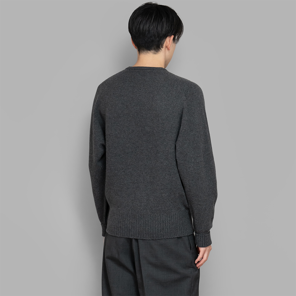 型は、ラグランの大きなアームホール、長めのリブ、コンパクトなクルーネックというバランスでベーシックでありながら、サイズバランスで特徴を持たせ、飽きの来ないバランスに仕上げています。さらに編立はホールガーメントで行っておりストレスフリーな着心地です。