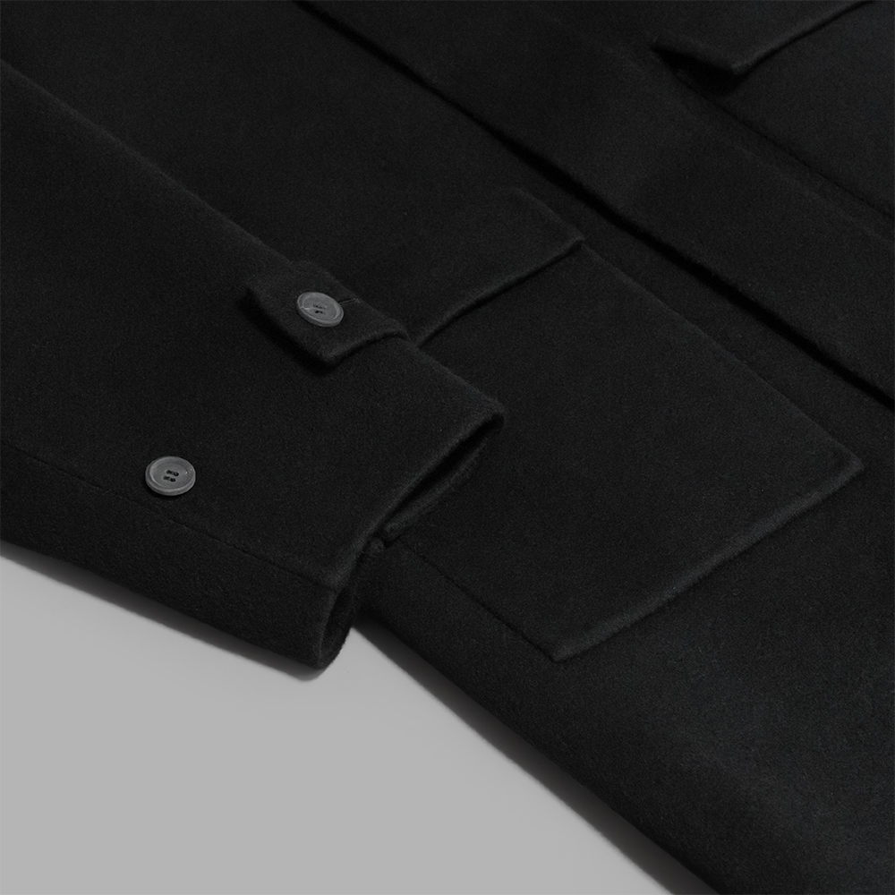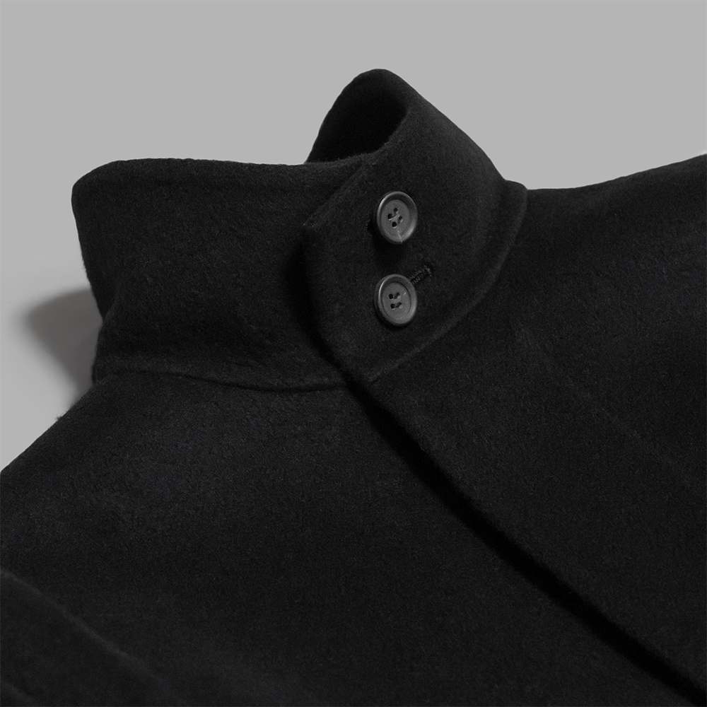 型は、全体的に程よくリラックス感のあるシルエットで製作された、25AWの新型となるスタンドカラーのコートです。ウエストベルトは内側に内蔵させ、左右のボタンで3段階の調節が可能です。袖口には深めのスリットを入れ、リラックスした表情に仕上げています。また、この仕様は、スリーブタブを調節した際、スリット部分が綺麗に重なり、収まりが良いという利点もあります。コットン素材の内ポケットが左に2つ、右に1つ付きます。
