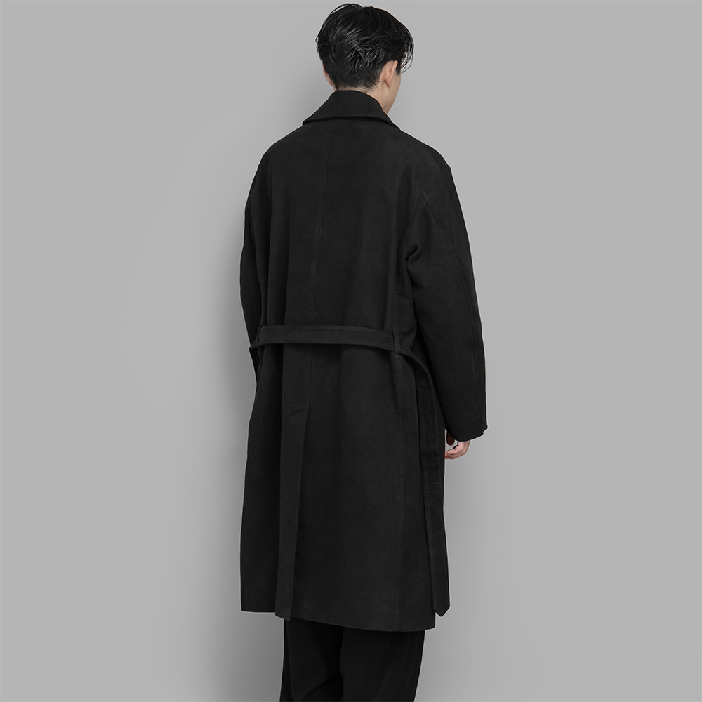 型は、以前にウールカシミヤで展開されていたミリタリーコートで、今期はサイズを今までよりも大きくしています。中は総裏で仕立てられており、身頃上部分と袖は滑りの良いキュプラで、身頃下はコットンネルになります。内ポケットが2つ付きます。